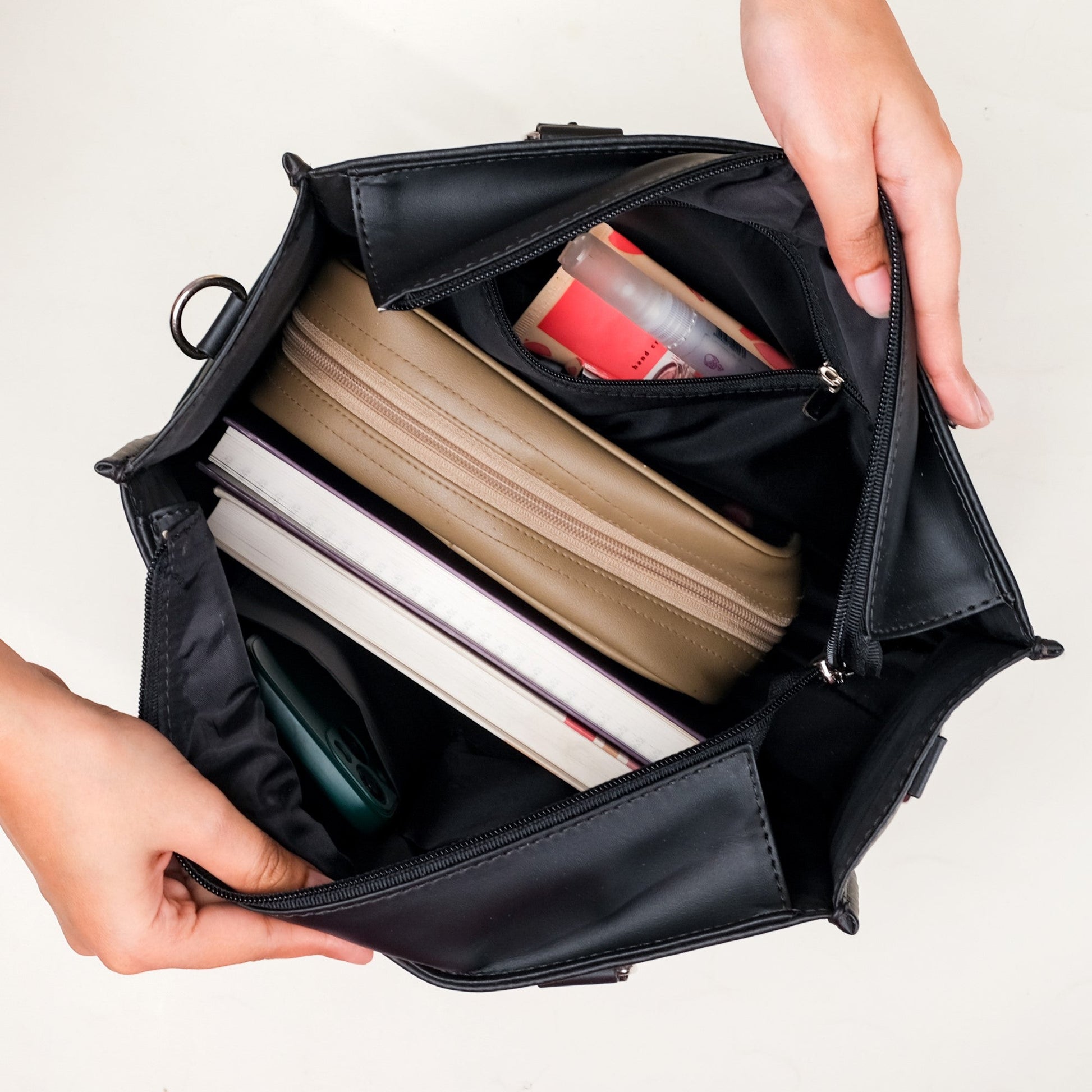 Perfect office bag to carry in your hand or sling on your shoulder. Say hello to the epitome of elegance with our stylish houndstooth handbag for women. Crafted from premium vegan leather, this ladies handbag is the chic accessory your wardrobe has been missing. Despite the sleek appearance, this structured bag boasts a spacious interior, with one main compartment, two inner pockets, and secure zipper pockets, allowing you to easily organise your bag and can hold iPads. The addition of the water-resistant inner polyester lining and smooth zipper system of this medium tote bag ensures that all your belongings are safe. The day bag also features two sturdy handles and one detachable and adjustable cross-body strap. Therefore, whether you decide to use this classic bag as a shoulder bag for a more polished ensemble, or as a crossbody handbag for a more casual look, this ladies handbag effortlessly combines style with convenience.
