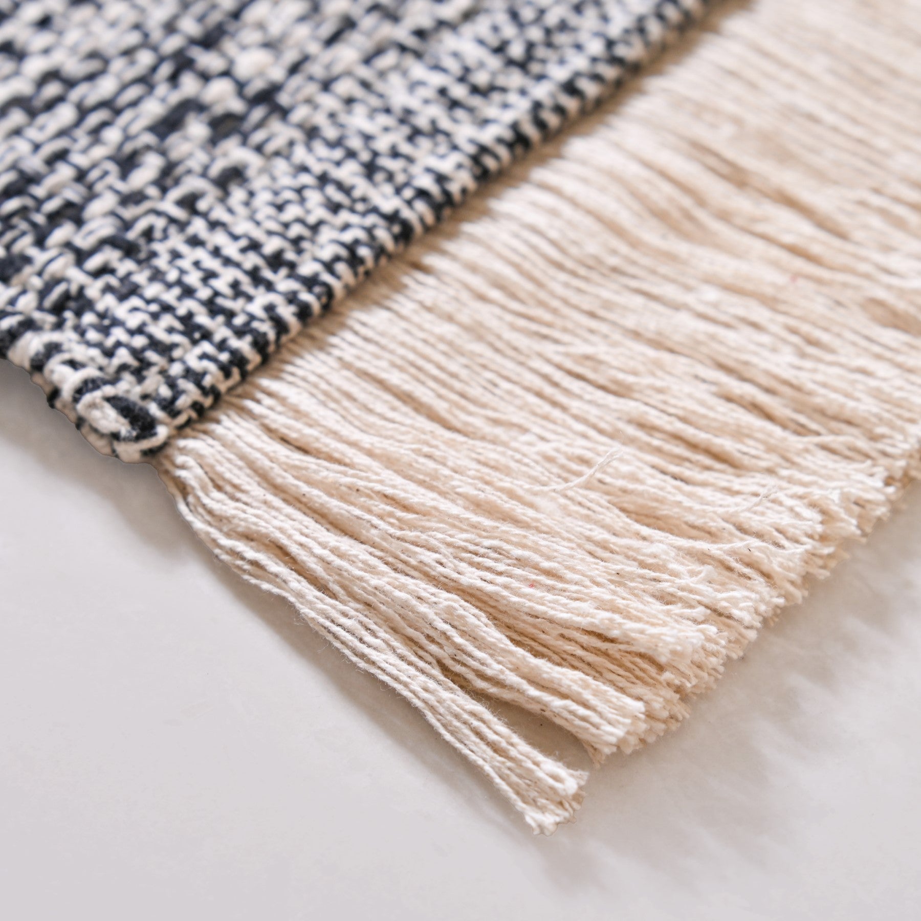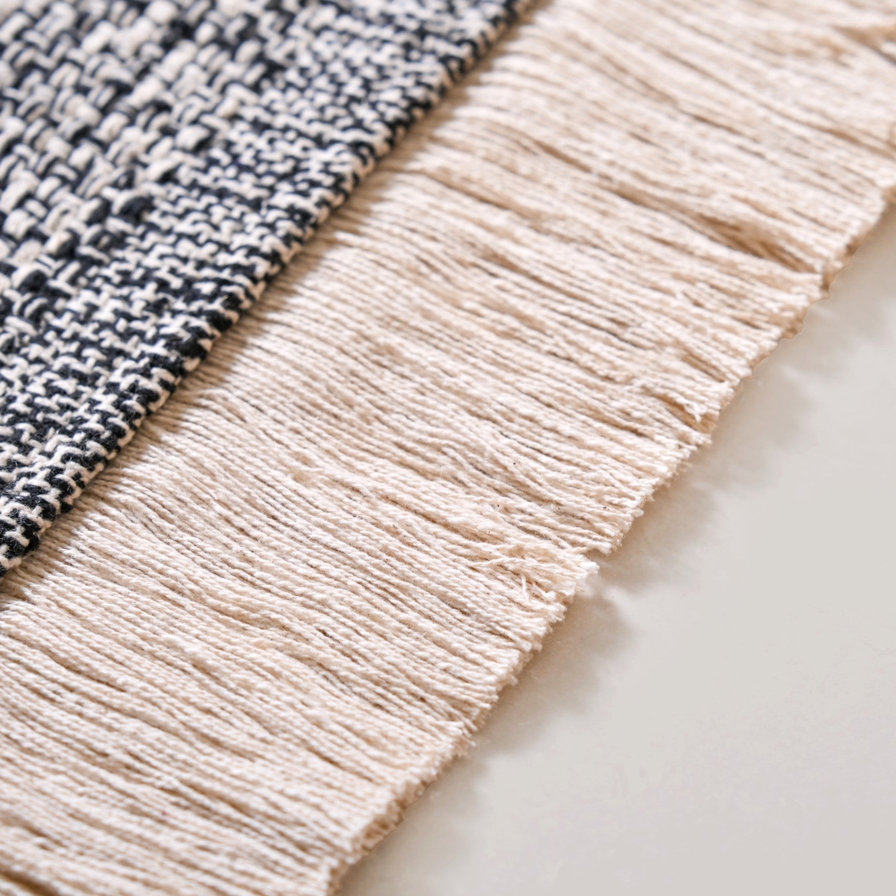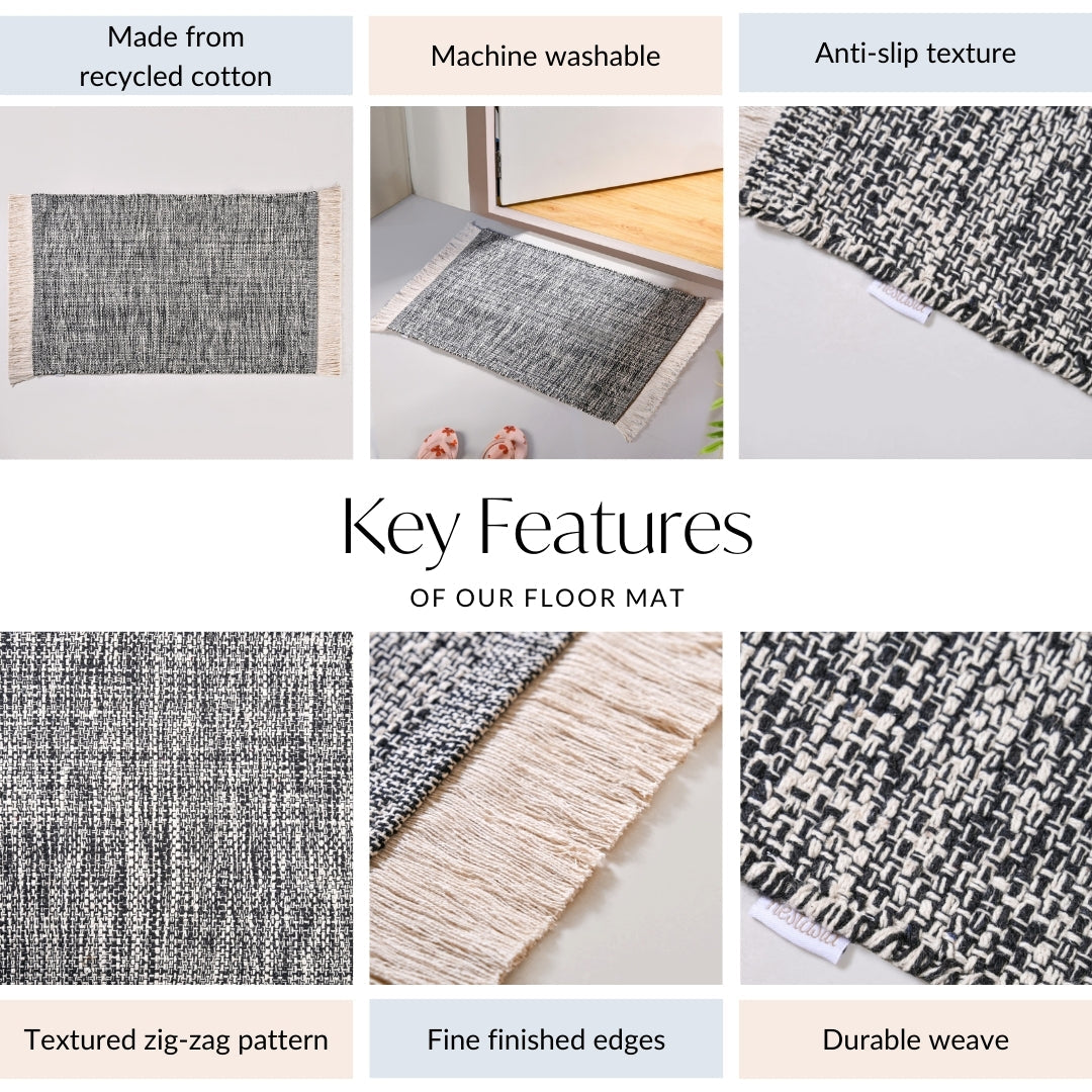 Benefits: Made from recycled cotton, this floor mat supports sustainable living while reducing waste. Its neutral black-and-white tweed pattern complements various interior styles. The tightly woven surface ensures durability and easy maintenance, while the textured design and fringed tassels add artisanal charm. Additionally, the soft cotton material provides a comfortable feel underfoot, as it is also anti-slip. Moreover, this mat requires very low maintenance and is best for daily use.