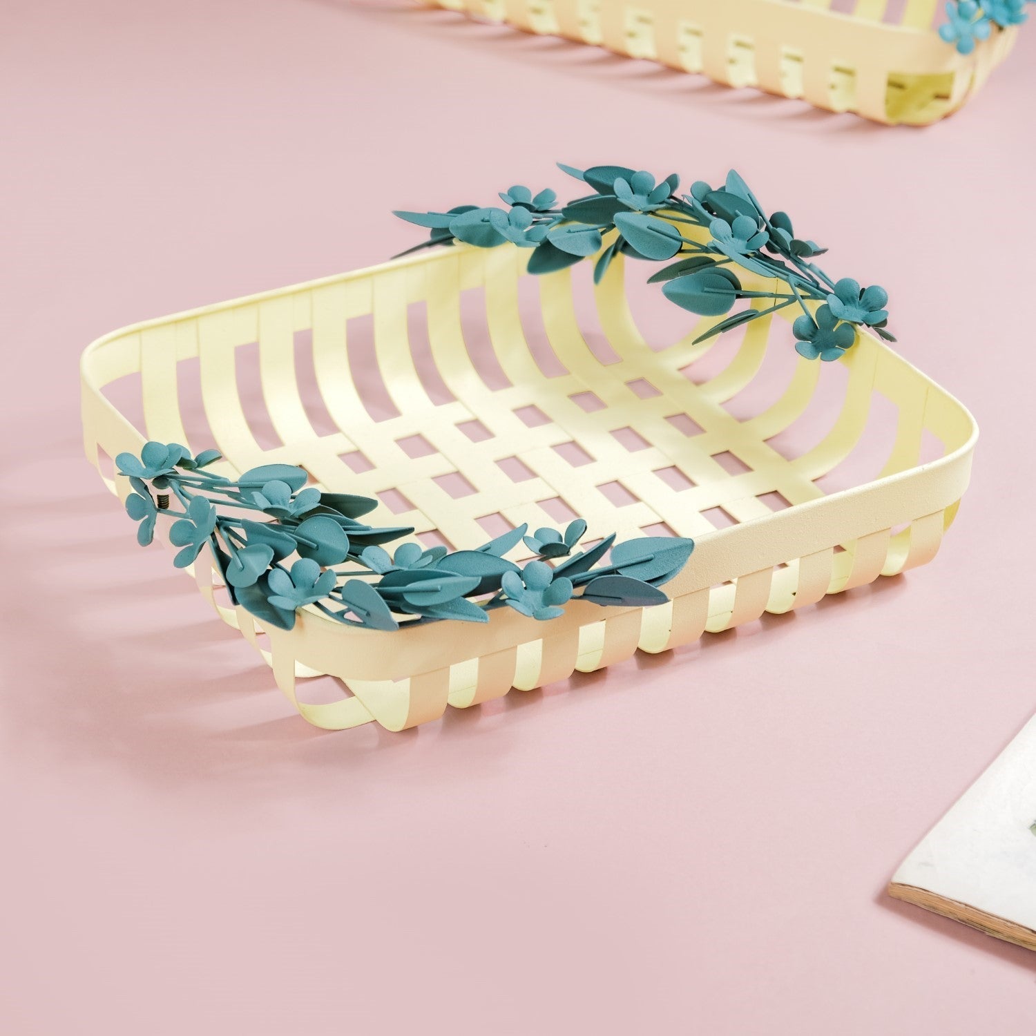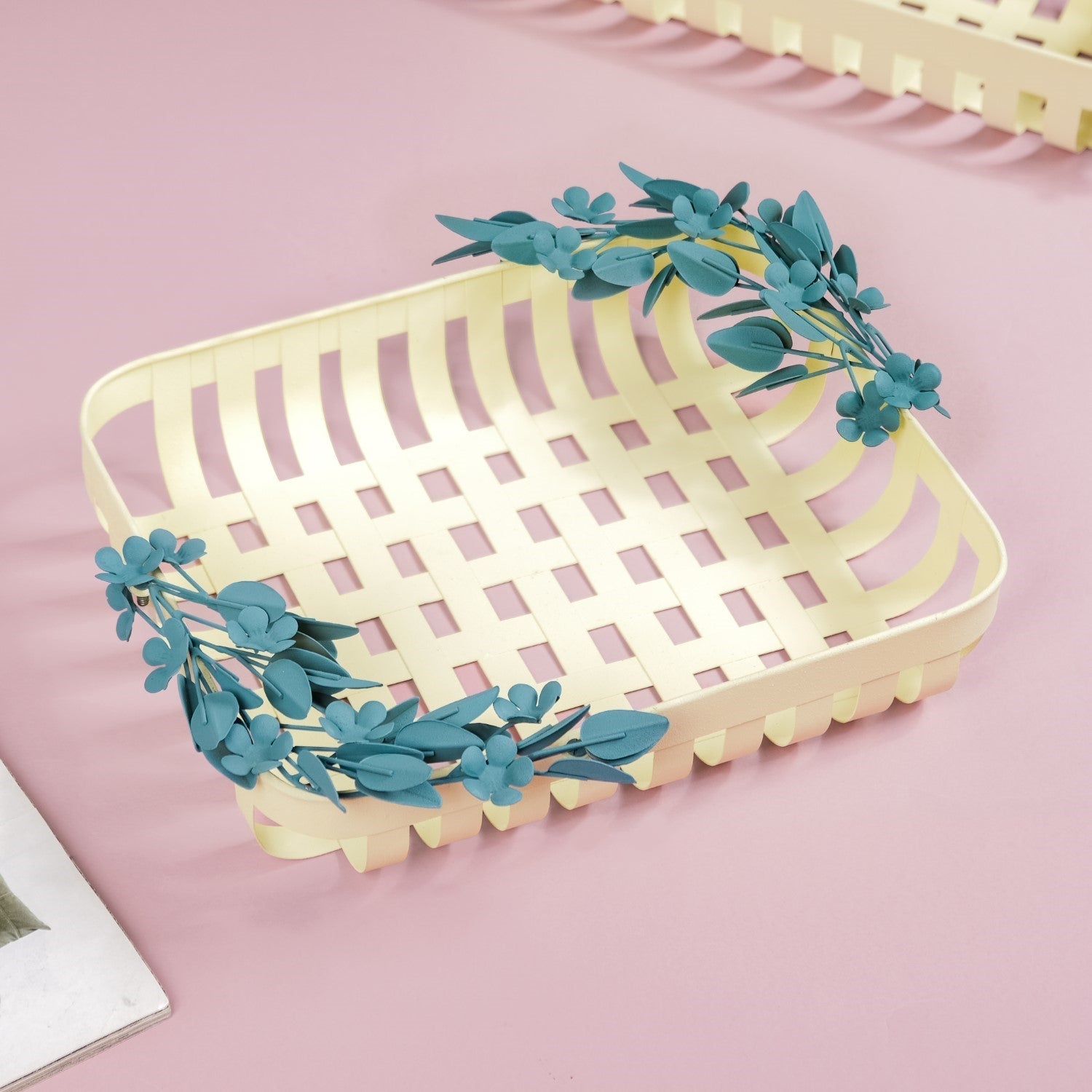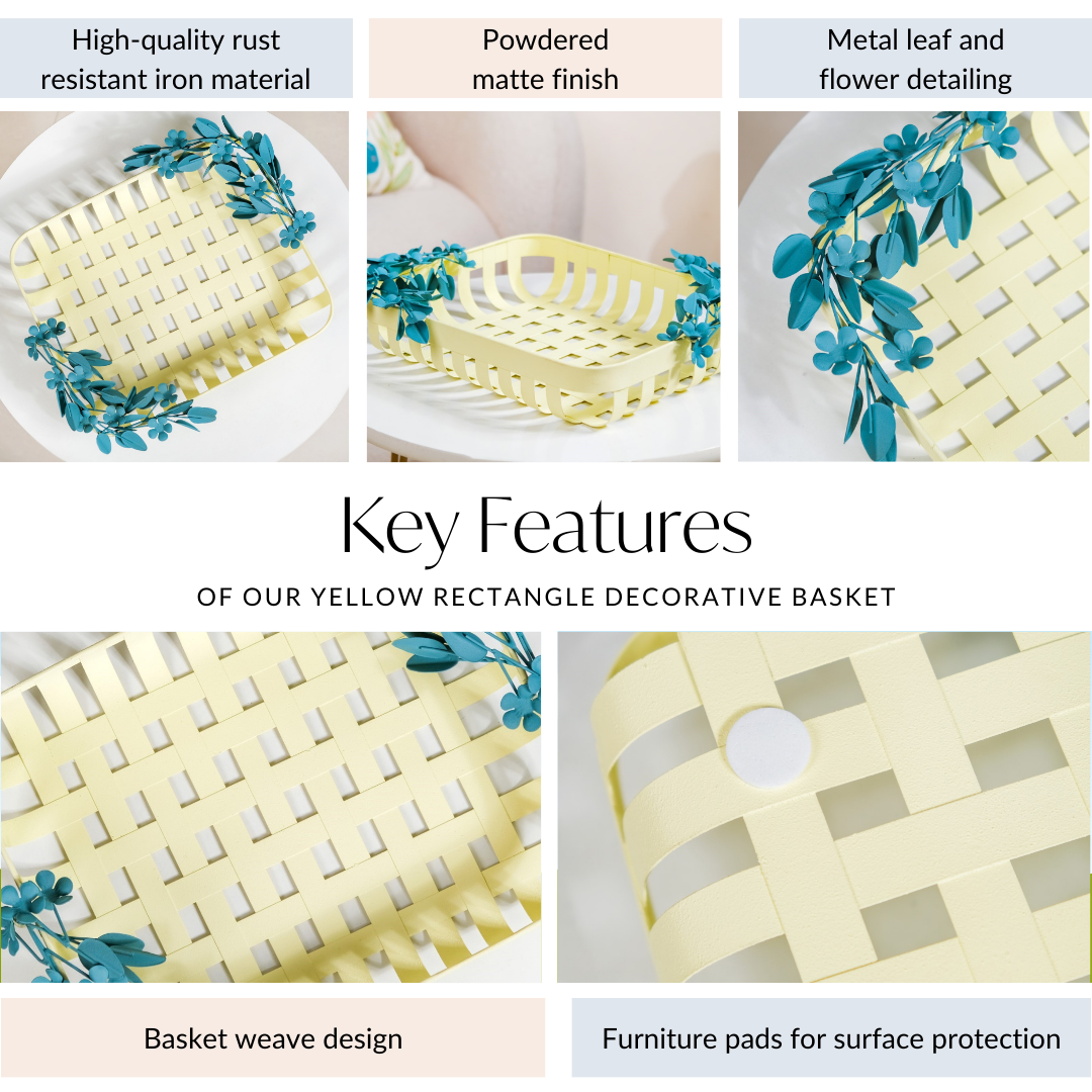 Introducing our stunning metal decorative basket, crafted to elevate your home decor effortlessly. Made from high-quality iron, this basket boasts durability and rust resistance, ensuring it stands the test of time. The powdered matte finish adds a touch of luxury, while the intricate metal leaf and flower detailing exude elegance. With its basketweave design, this piece adds texture and visual interest to any space. Equipped with furniture pads for surface protection, it's both practical and stylish. Whether used for storage or as a decorative accent, this versatile basket is easy to clean and perfect for any room in your home.