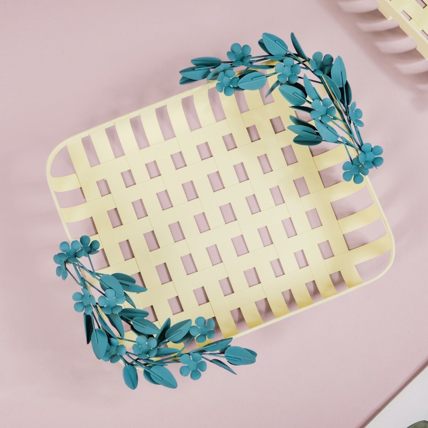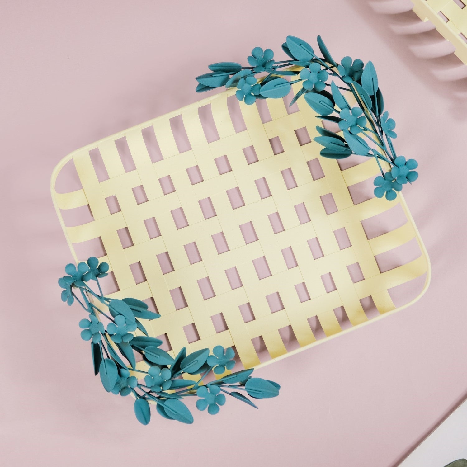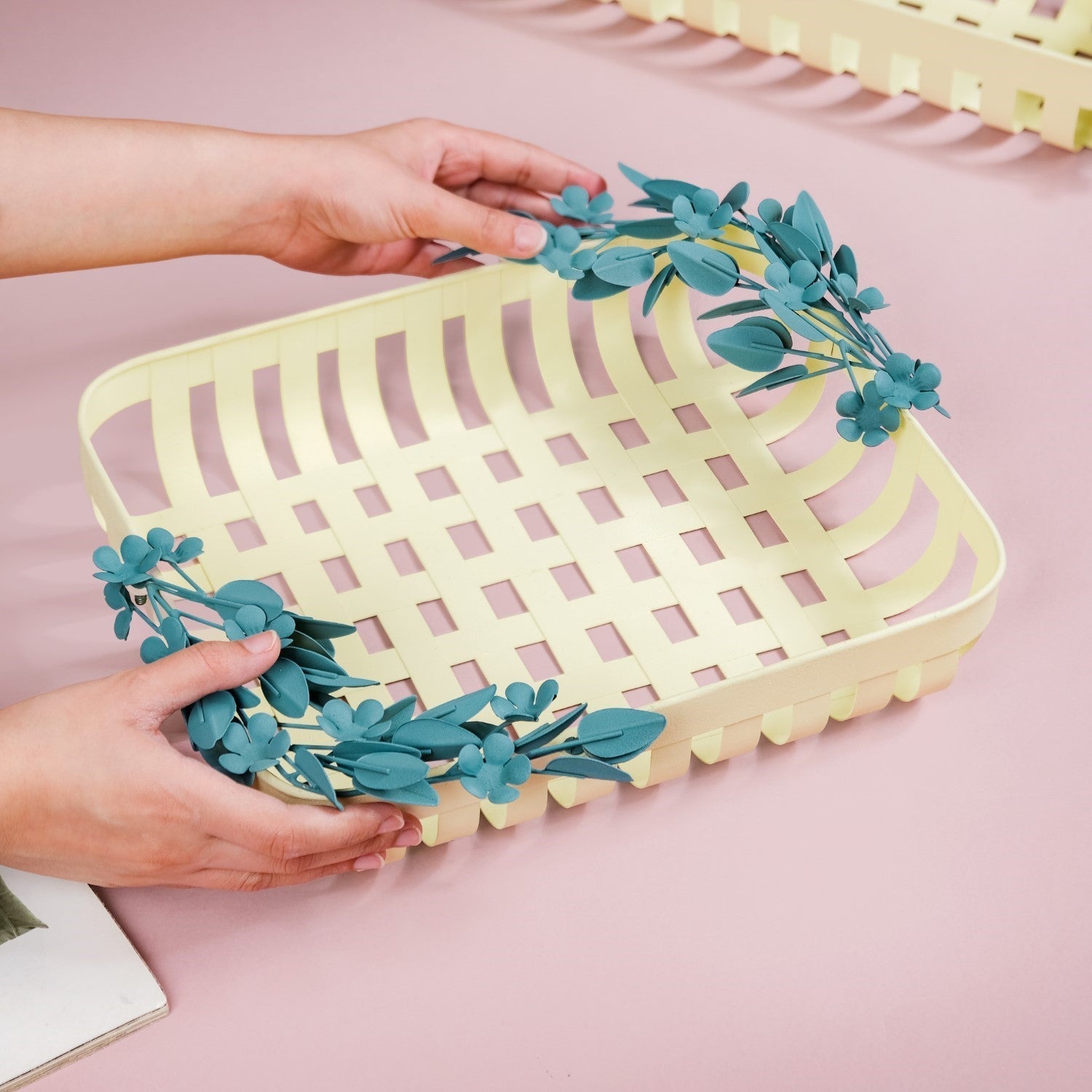 Introducing our stunning metal decorative basket, crafted to elevate your home decor effortlessly. Made from high-quality iron, this basket boasts durability and rust resistance, ensuring it stands the test of time. The powdered matte finish adds a touch of luxury, while the intricate metal leaf and flower detailing exude elegance. With its basketweave design, this piece adds texture and visual interest to any space. Equipped with furniture pads for surface protection, it's both practical and stylish. Whether used for storage or as a decorative accent, this versatile basket is easy to clean and perfect for any room in your home.
