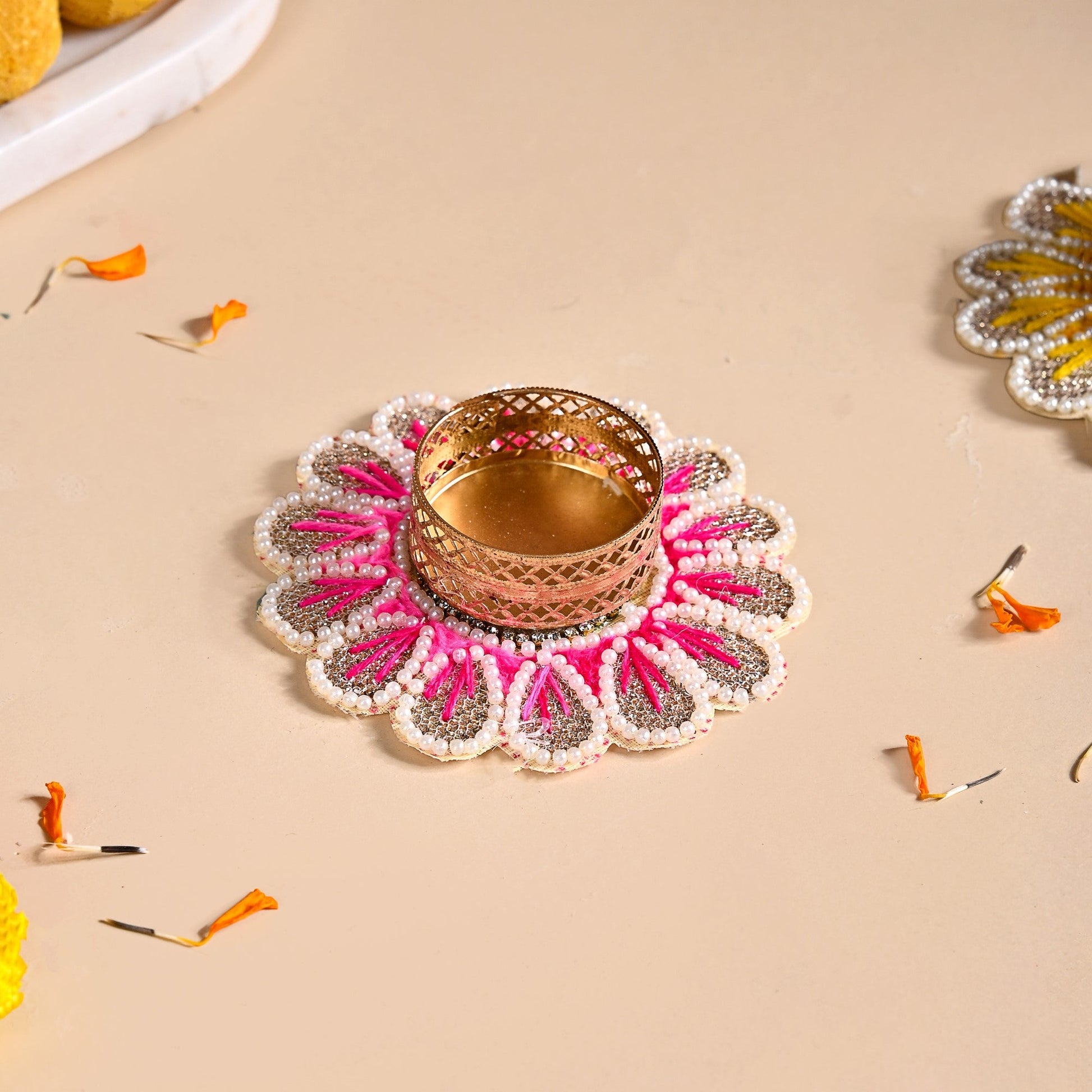 Design: The eye-catching candle holders showcase a tapestry of details, showcasing opulent gold sheet metal cases with intricate cutwork. Each receptacle rests on a bed of expertly fashioned fabric flower petals enhanced by applique work. Complemented by silver, magenta, and yellow threadwork, and glistening artificial pearls, these fabulous tea light holders embody expert craftsmanship.