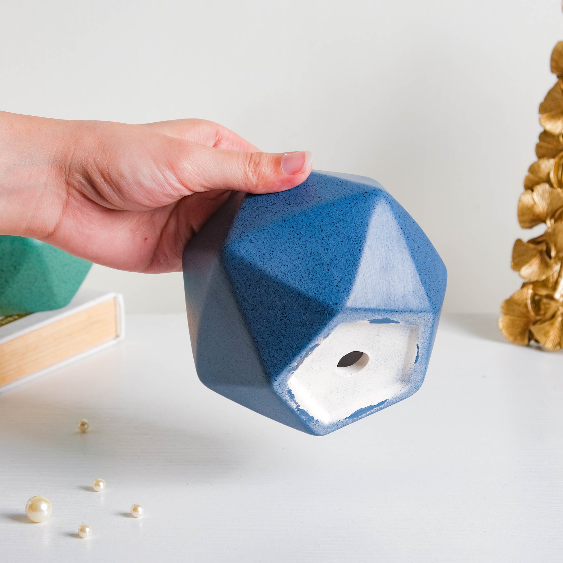 The small hexagonal pot in a bright shade of blue lends a stylish appeal to the home decor. Crafted in ceramic, the plant pots are designed in a unique and sleek way to complement a modern and contemporary setting. The speckles on the outer surface give the pot a rustic look. The small plant pot can double up as a desk planter. The planter has a solid color with dotted patterns that can enliven a desk or table with its color and vibe. The table planter can be paired with other planters of muted shades and placed on a wall shelf or at the window sill.