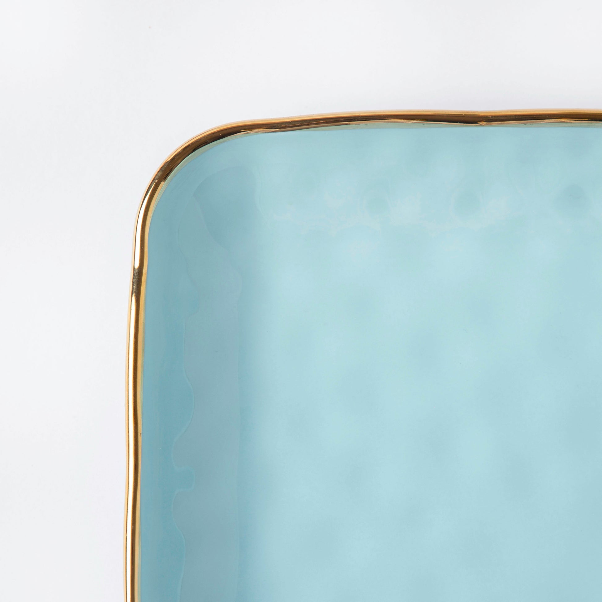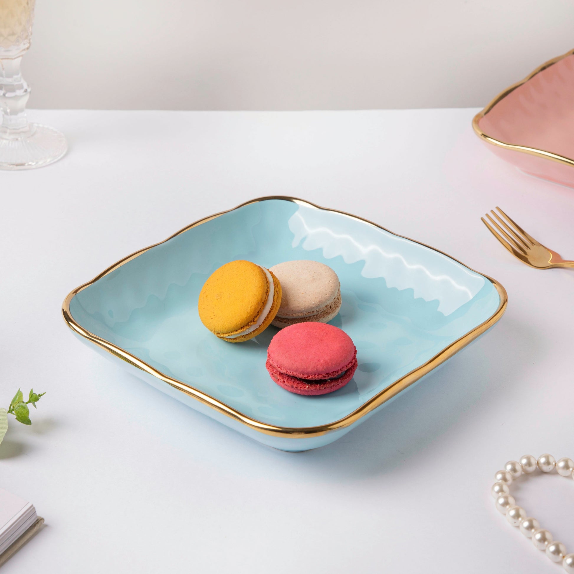 The square-cut snack plate has elevated edges and a gold-lined rim. Consider when one wishes to present snacks in a fancy way at the parties. The sleek, square cutting helps to accentuate the shape of any food served on the plate. One can use the ceramic plate to serve sushi, khaman dhokla, bread rolls, steak, or pav bhajis. The Blue Jay snack plate can also be used as a pasta plate since it has raised rims.