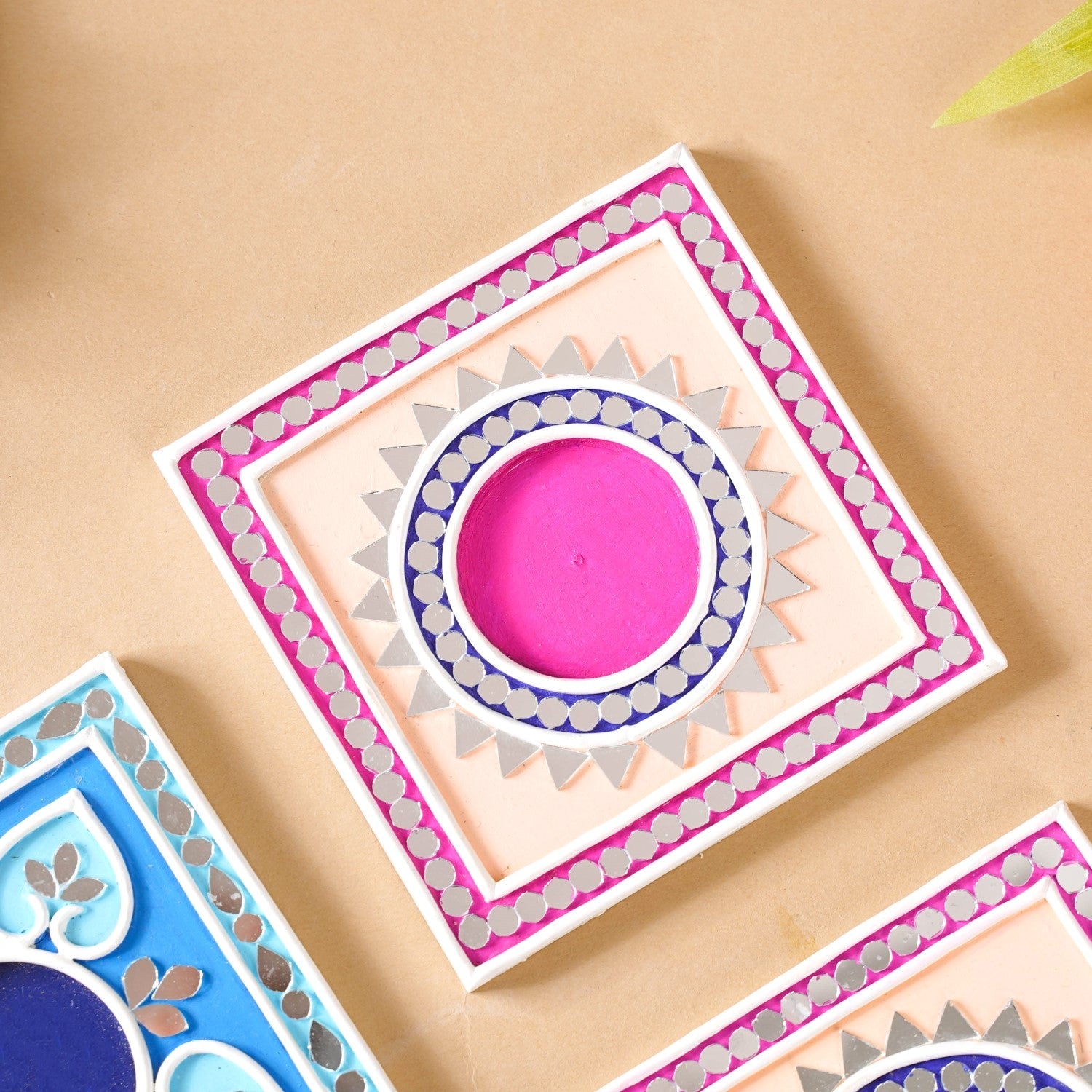 Benefits: Each tealight candle holder is crafted from MDF, offering a perfect balance of strength and eco-friendliness. MDF is known for its durability and smooth finish, making it an ideal choice for showcasing detailed Lippan art while adhering to sustainable practices. The glass mirrors embedded in the geometric designs not only enhance the artistic patterns but also ensure a lasting shine that elevates the overall aesthetic. This combination of materials provides both enduring beauty and functionality, ensuring that your candle holders remain a striking and responsible addition to your home decor.