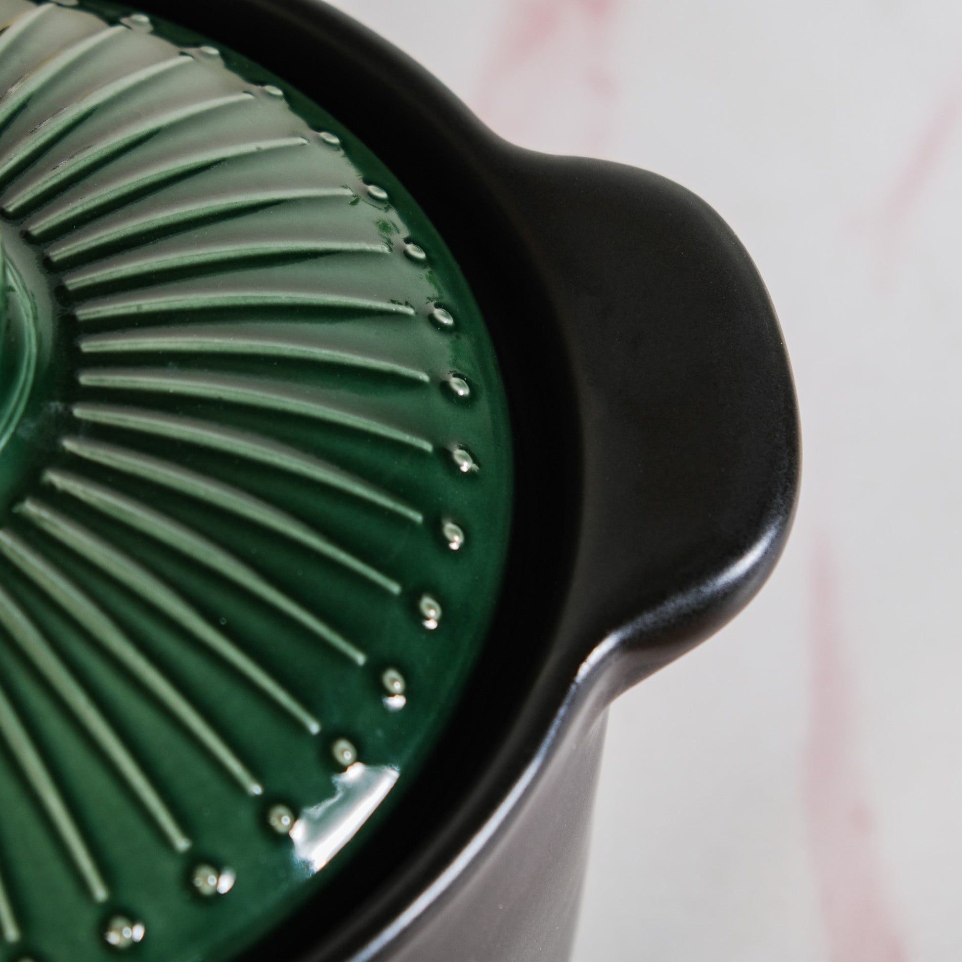Design: This ceramic cooking pot is where style meets everyday practicality. The glossy olive green lid stands out with its modern ribbed design that radiates from the centre of the knob, while the sleek, matte black base gives it a bold, timeless look. At the center of the lid, a uniquely shaped knob along with three steam vent is added to keep cooking just right. The seamless, sturdy side handles look just as good on display as it does in action. Whether you're simmering, serving, or simply showing it off, this pot adds a touch of elegance to any kitchen.