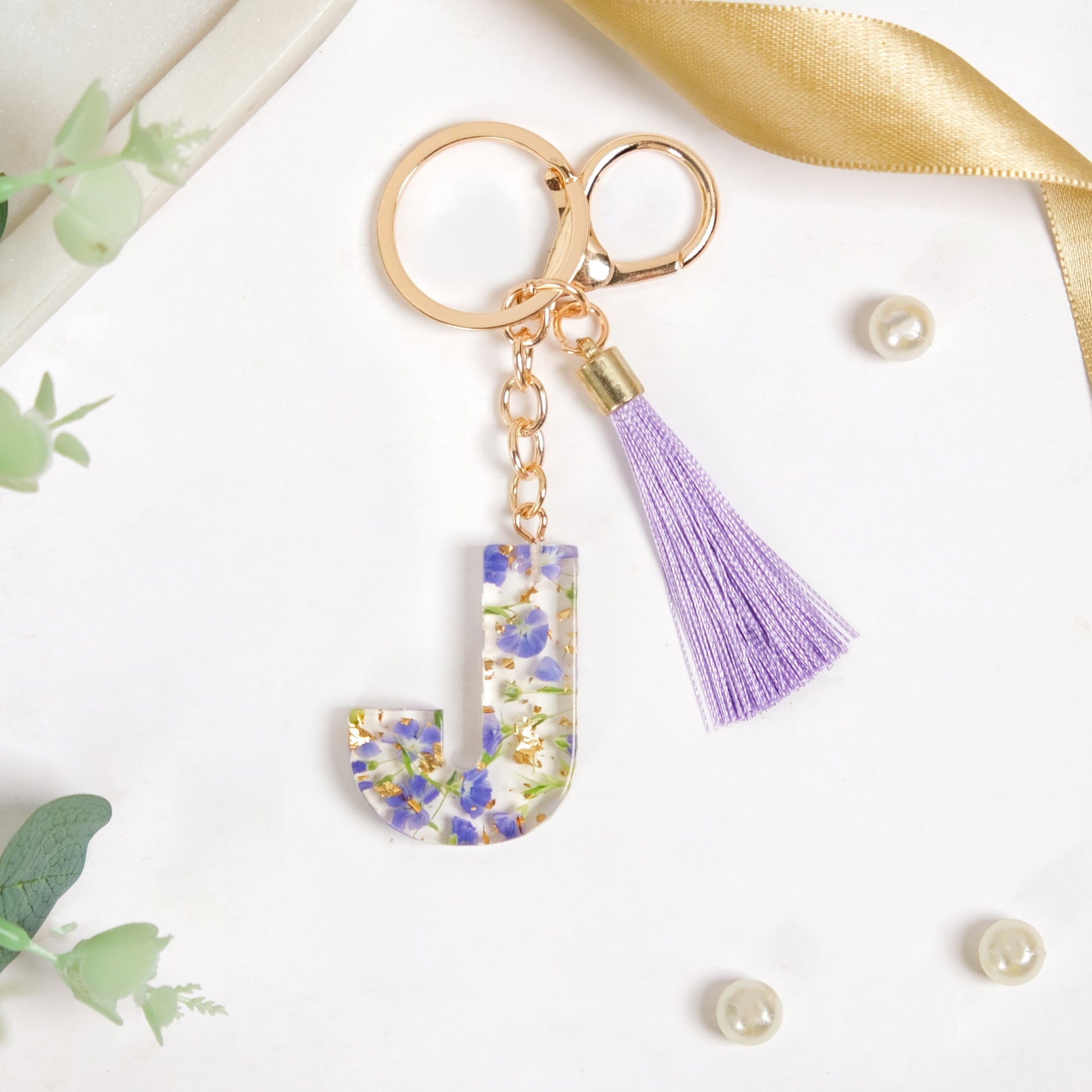 Botanical Harmony Letter J Resin Art Keychain