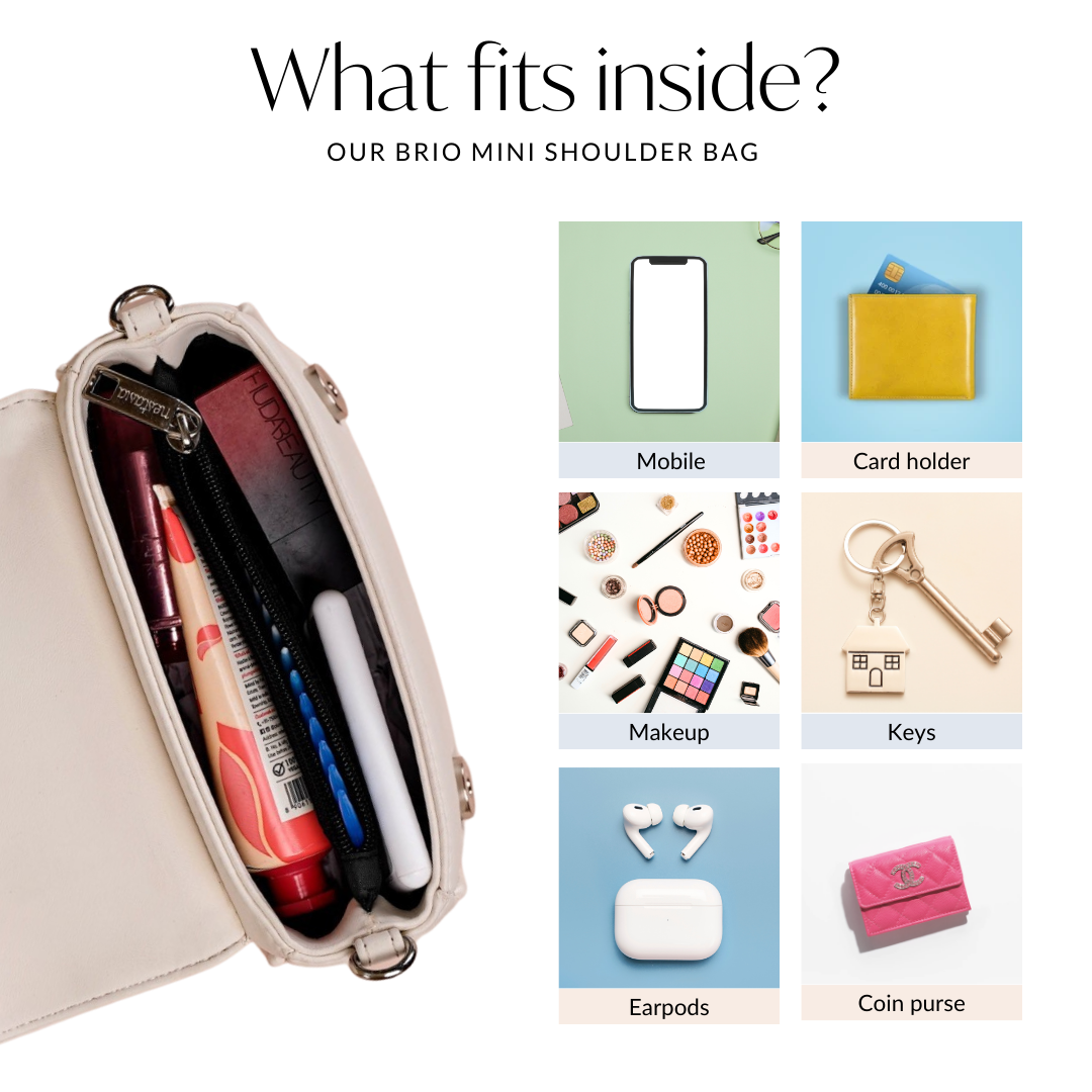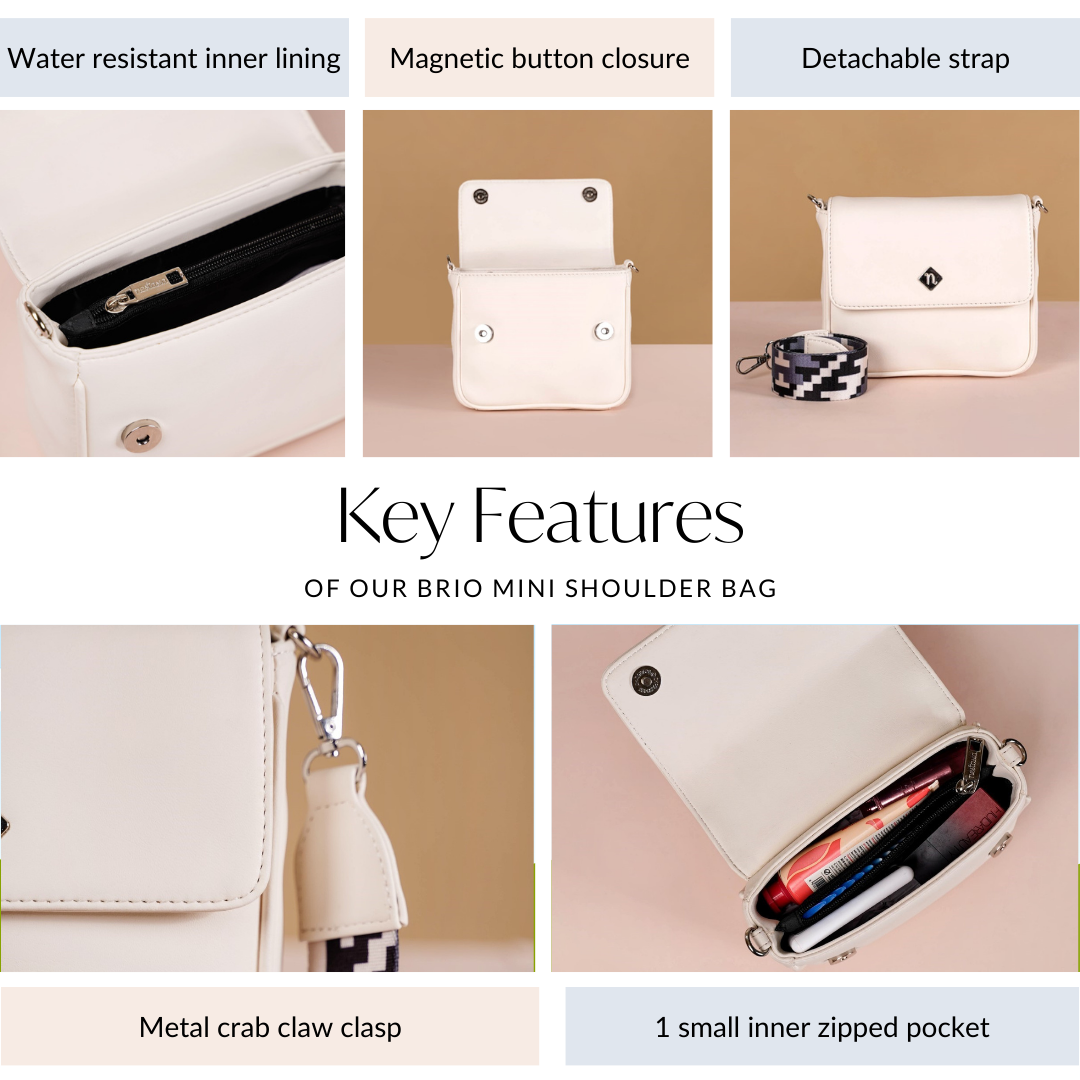 Design: Our Brio shoulder bag is a mini marvel that packs a punch in bold colour, style and functionality. Crafted from premium vegan leather with a sleek matte finish, this compact companion is the epitome of modern luxury. The bag overall has a refreshing look. Its magnetic button closure and smooth zipper system make accessing your essentials a breeze, while the detachable strap with a metal crab claw clasp offers versatile carrying options. Inside, you'll find a small zipped pocket for secure organization, complemented by a water-resistant inner lining to keep your valuables safe and dry.