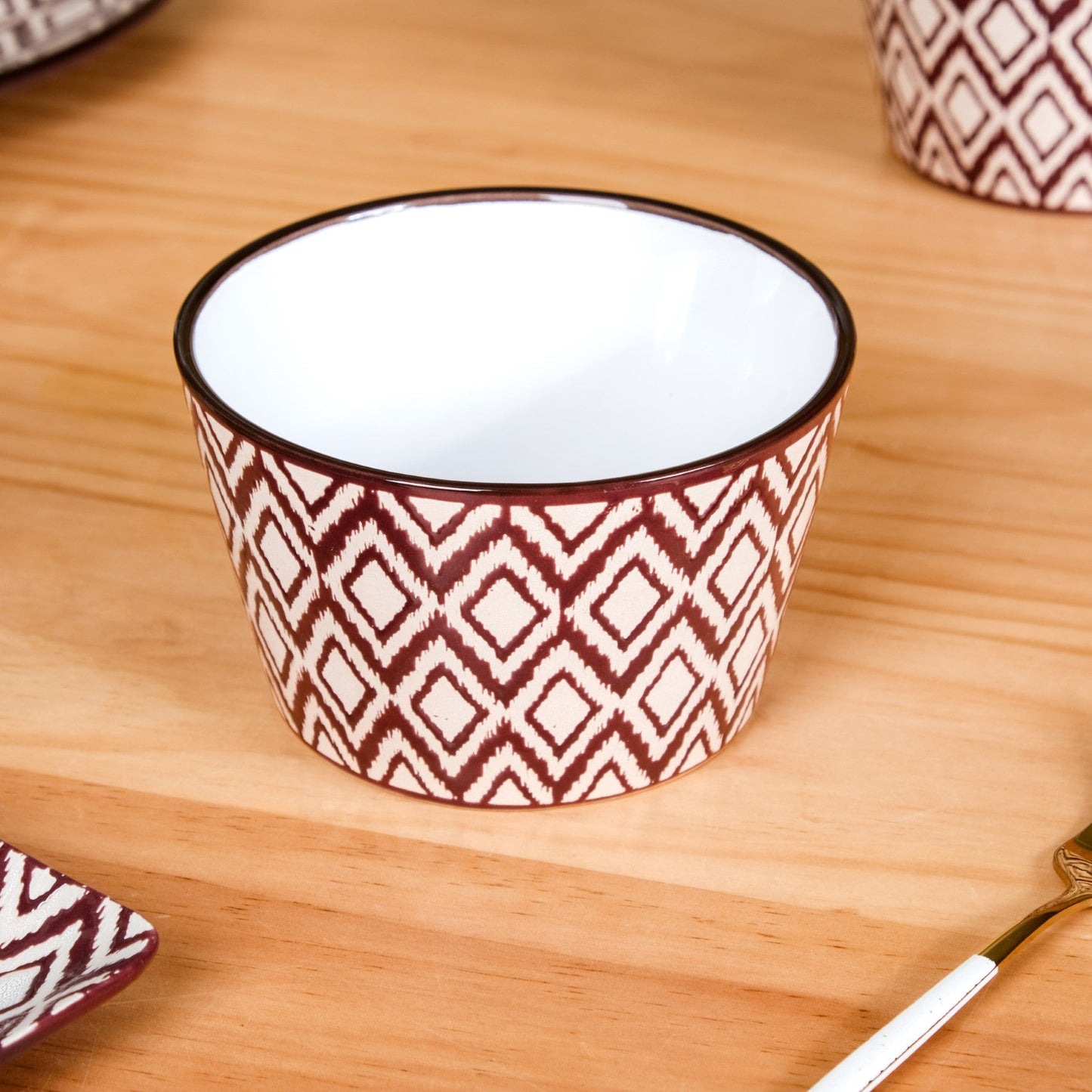 Design: Showcasing a chic diamond ikat pattern in rich brown and classic white, these serving bowls make a sophisticated statement. The subtle conical shape enhances their ergonomic design, providing an easy grip while handling the serving bowls.