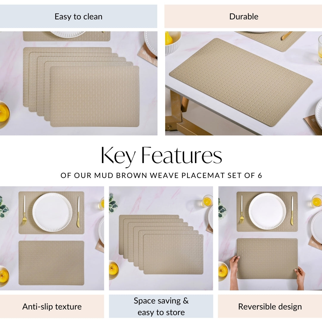 Design: Crafted from strong, long-lasting PVC, this set includes 6 rectangular mats in a deep mud brown tone. The bold basket weave pattern gives them a distinct textured finish that’s easy to feel and even easier to style. Thick and sturdy yet flexible enough for daily handling, each mat is sized to hold a full place setting comfortably. The mats are heat-resistant, water-resistant, and reversible, offering practical function alongside modern aesthetics. A textured backing prevents slipping on most surfaces, making them ideal for busy households and stylish spreads alike.