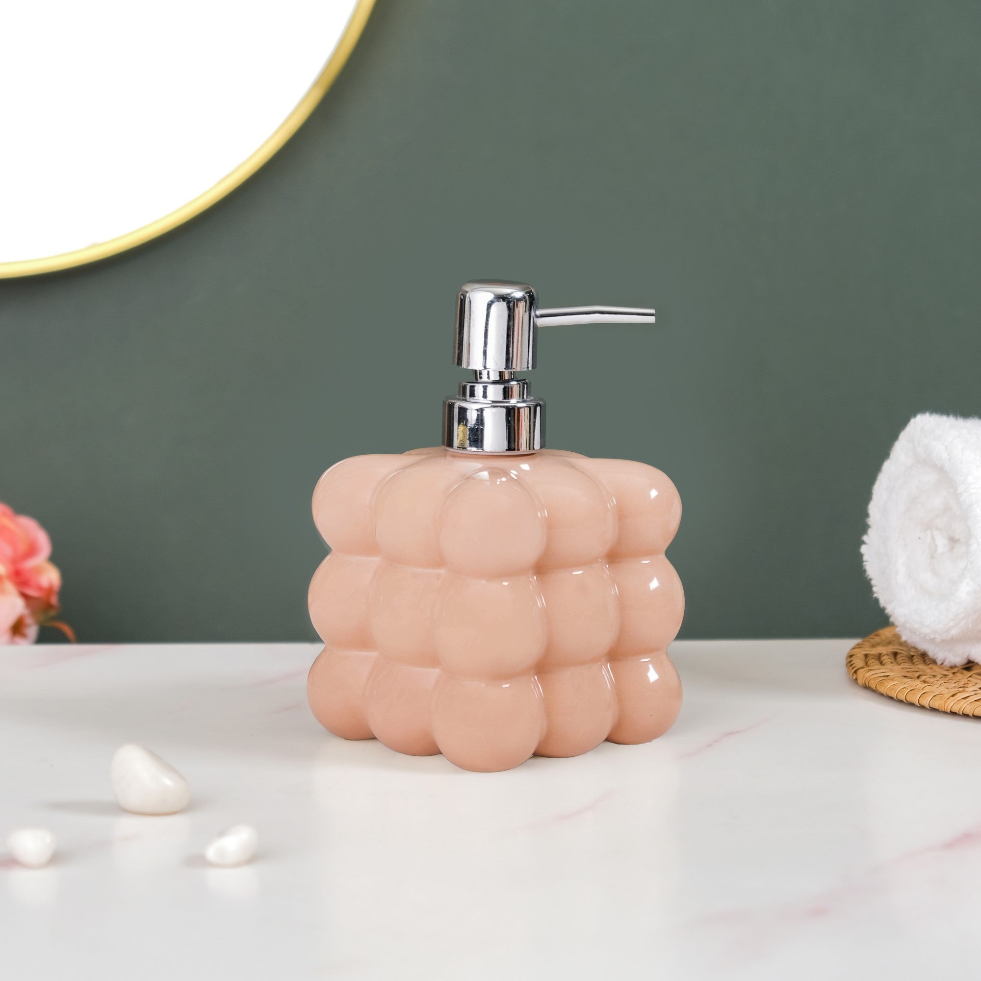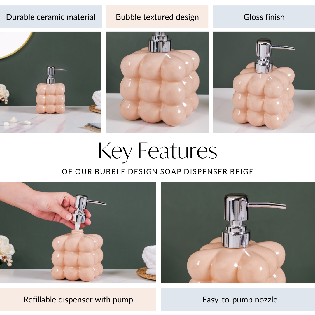 Spruce up your bathroom or kitchen decor with our exquisite soap dispenser, expertly crafted from durable ceramic material. This refillable handwash dispenser features an easy-to-pump nozzle, ensuring effortless use. The bubble-textured design of this liquid soap dispenser, combined with a glossy finish, adds a touch of elegance and sophistication to any space. The plump bubble design coupled with the soothing beige colour creates a ton of visual intrigue, whether you place it on your kitchen sink or bathroom basin counter. Enjoy both functionality and style with this expertly designed dispenser, perfect for any modern home.
