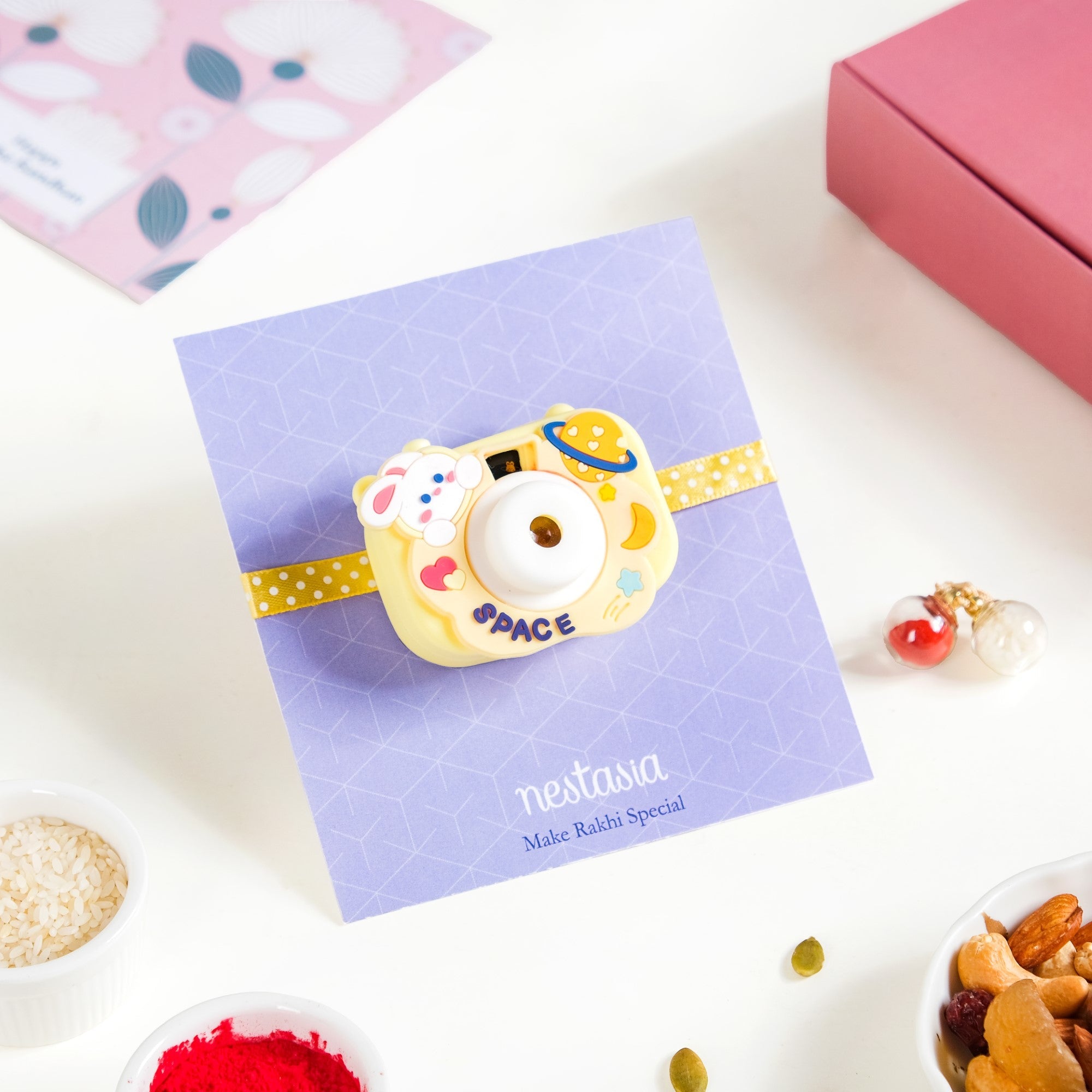 Create lasting memories with our mindful selection of Rakhi essentials. Inside the Raksha Bandhan gift box, you will find 1 Rakhi band, 1 roli-chawal set, and 1 pack of mixed dry fruits (free gift). But that's not all - the Rakhi band features an adorable bunny camera that lets the little one browse through different bunny snaps with the click of a button. Once they peer into the peephole at the back of the camera, they get access to their own doorway to the enchanting kawaii land with an array of sights to behold. This takes the Rakhi band beyond a mere accessory, transforming it into their soon-to-be-favourite toy. Ease into the customary rituals with the roli-chawal set, and turn the heartfelt occasion into an indulgent affair with the delectable medley of dry fruits.