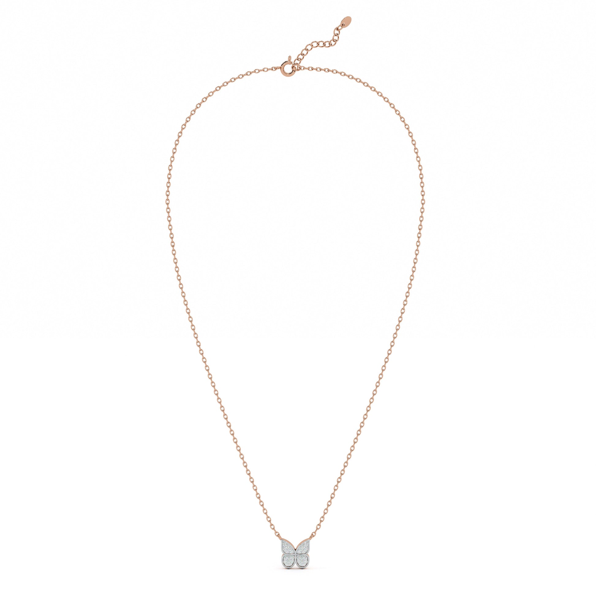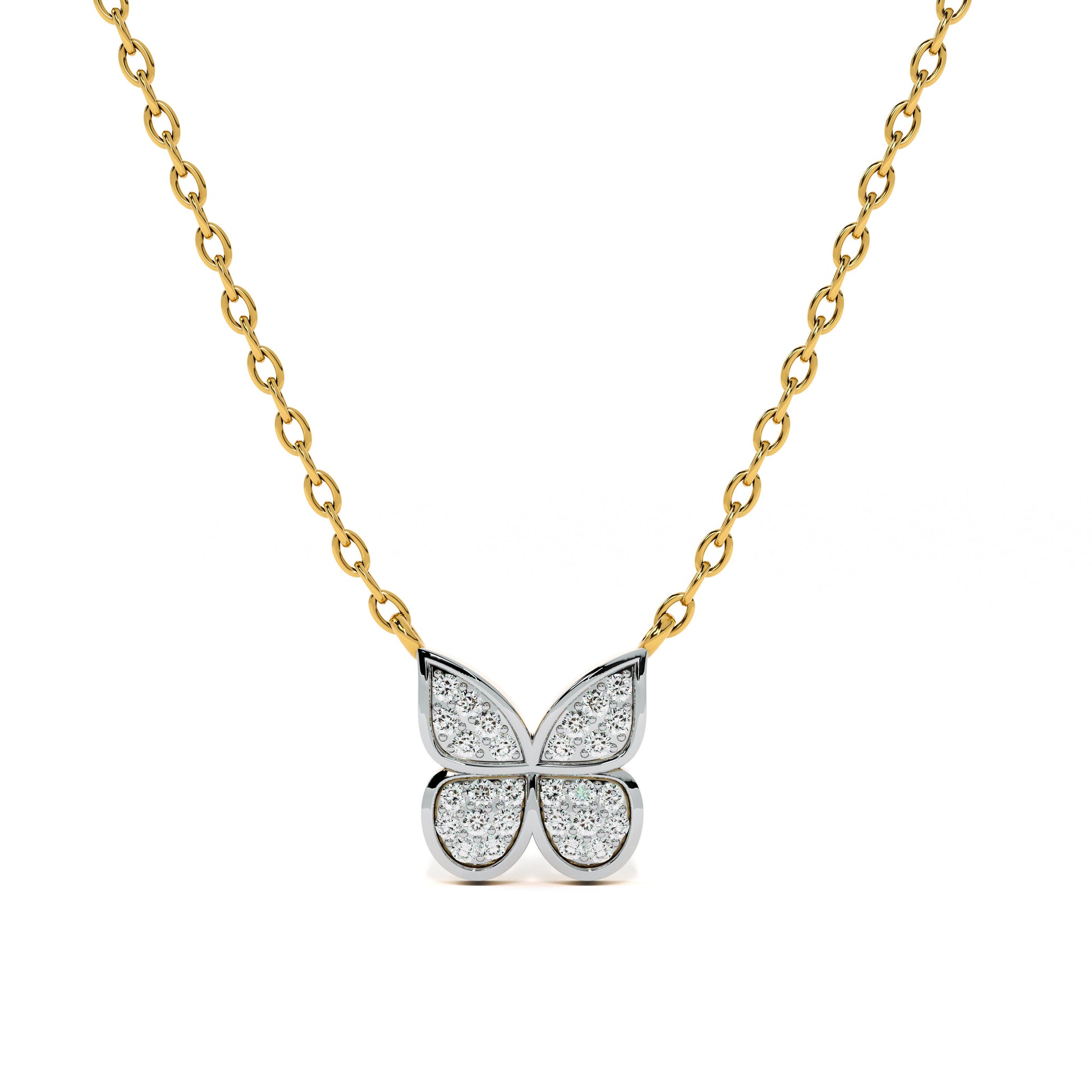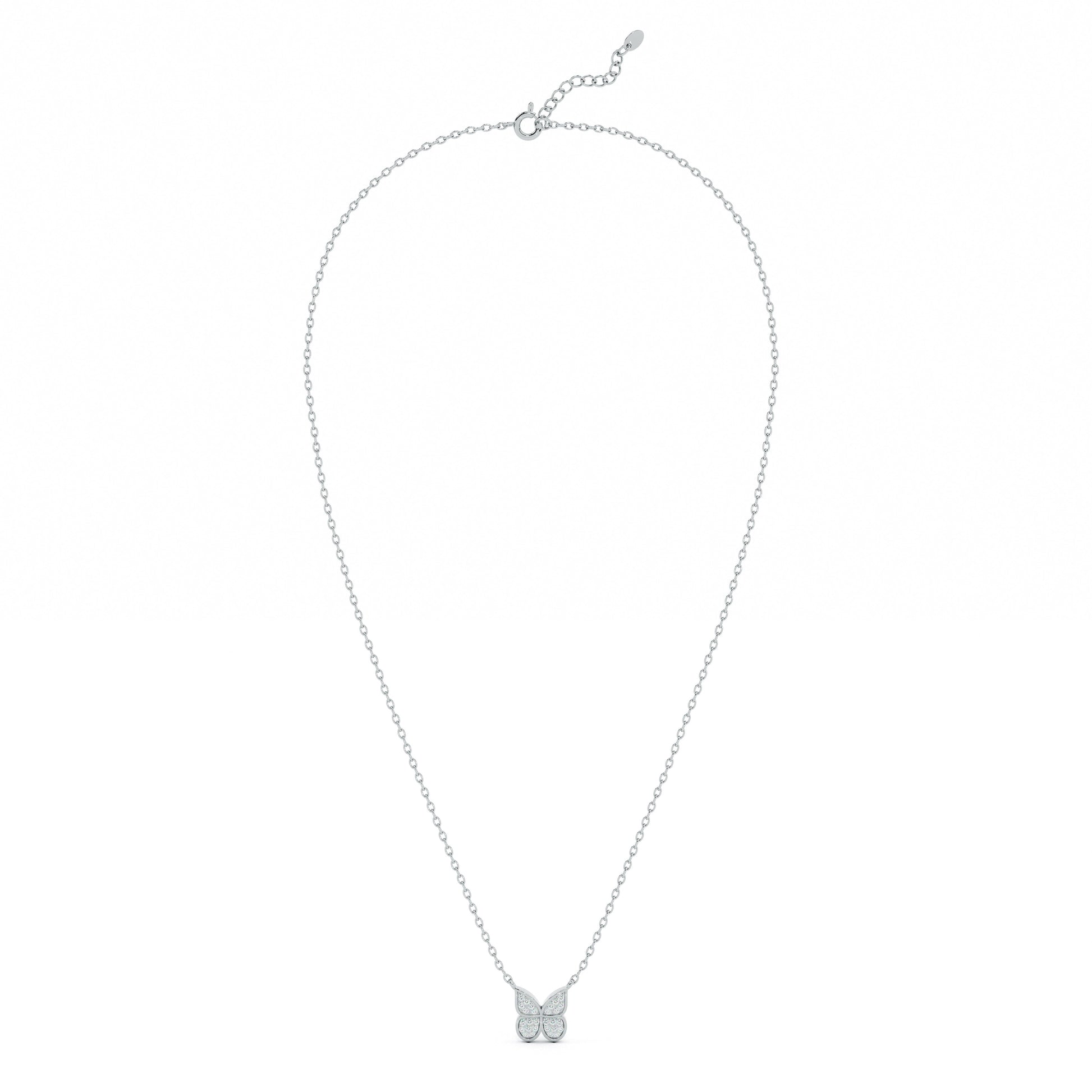 Inspired by nature’s delicate beauty, this necklace features butterfly wings adorned with shimmering lab-grown diamonds. The graceful design embodies freedom, transformation, and elegance, making it a captivating choice for nature lovers and fashion enthusiasts alike. Perfect for celebrations or adding a touch of whimsy and sparkle to any outfit, day or night.