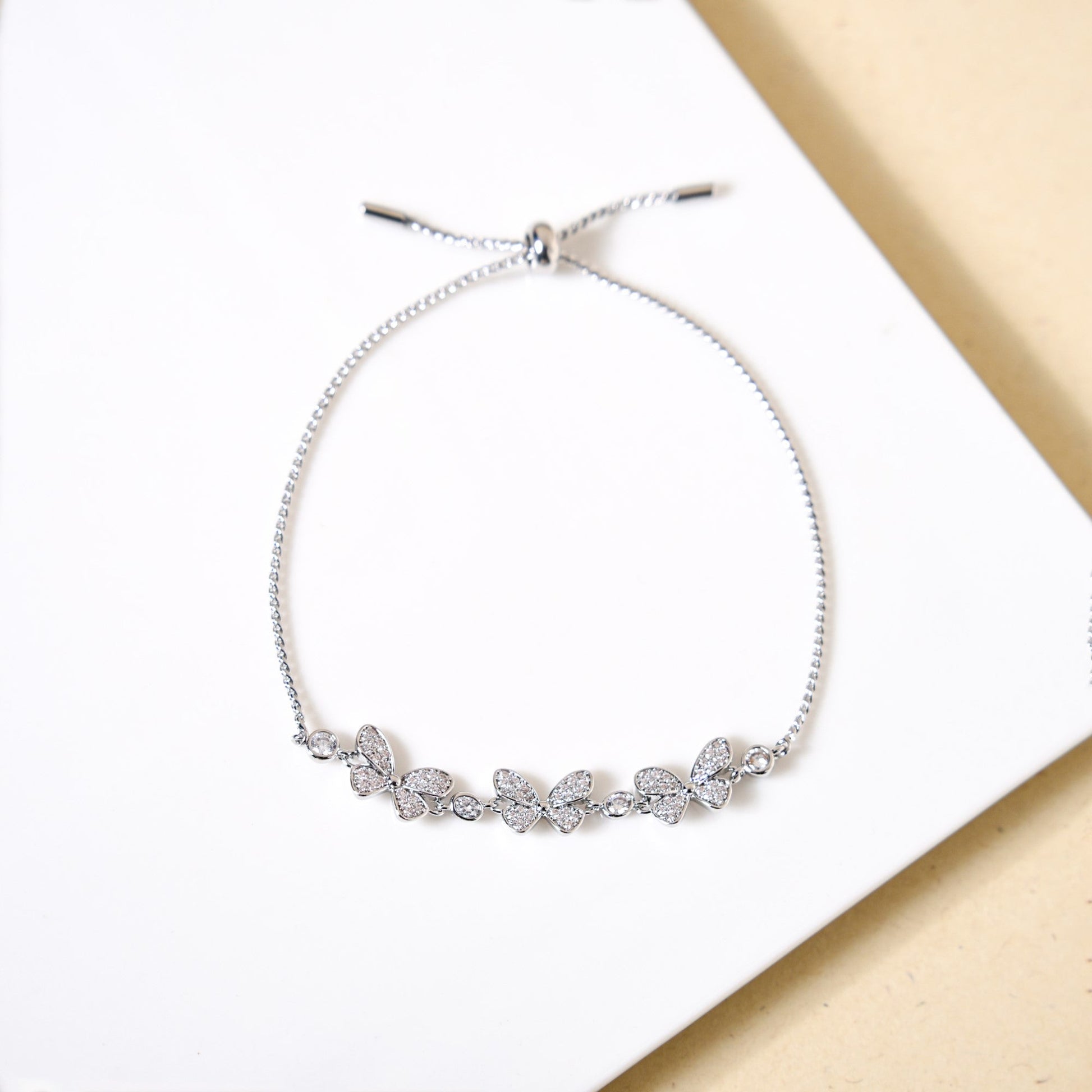 Fluttering with charm and sparkle, the silver chain bracelet is a timeless addition to your jewellery collection. Adorned with stone-studded butterfly charms, each delicate detail catches the light in the most captivating way. The shimmering silver chain provides a graceful foundation for the butterflies, making it perfect for both casual and formal occasions. With an adjustable fit for comfort, this charm bracelet effortlessly elevates any ensemble, offering a blend of elegance and whimsy that’s sure to catch the eye. A thoughtful gift for anyone who loves nature-inspired beauty.