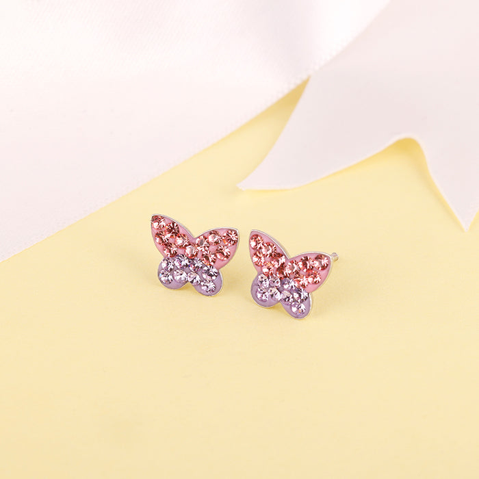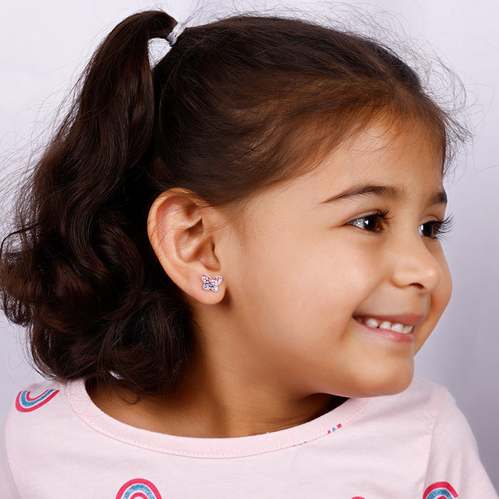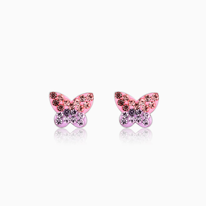 The silver earrings have a cute butterfly design with wings studded with pink and purple coloured stones.