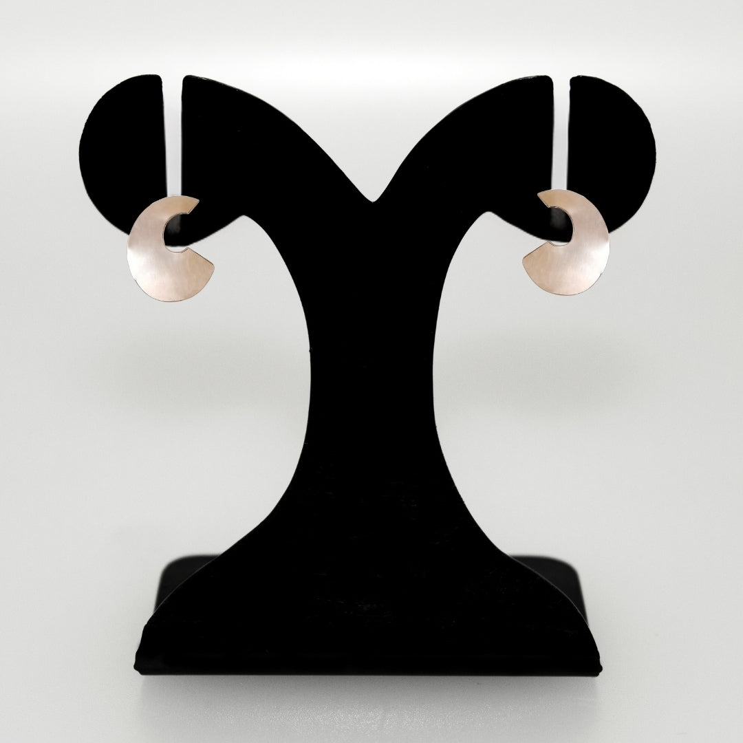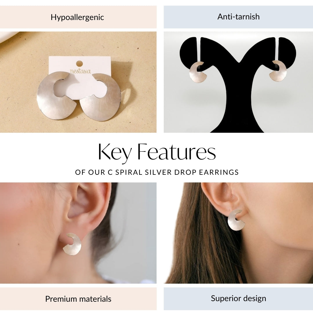These silver C-shaped drop earrings are a striking blend of abstract art and modern design. With their unique spiral form, each earring twists and curves in a fluid, sculptural shape. Made from durable metal, the earrings exude a sleek, contemporary vibe, while the open, airy design gives them a lightweight, almost ethereal feel.