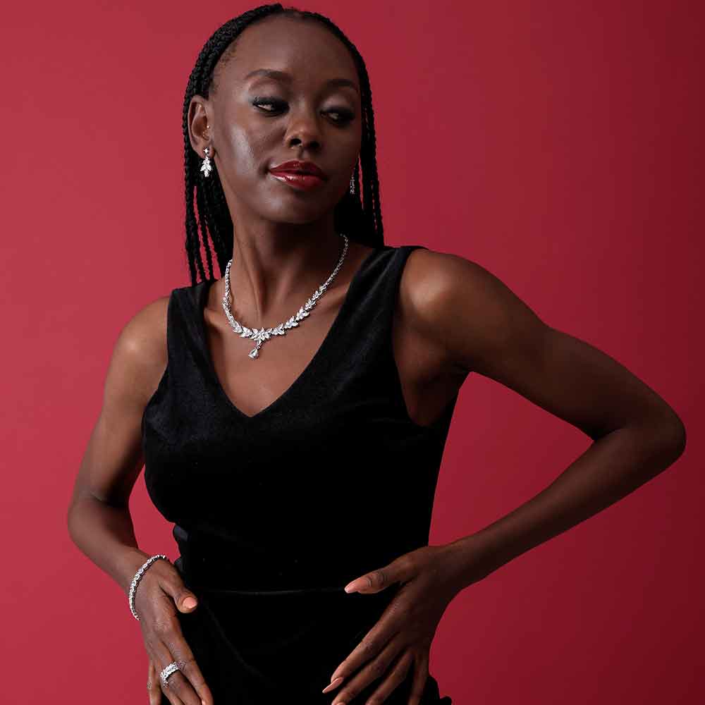 Classical in design yet refreshingly minimal, this necklace set is an ode to timeless beauty. A single glittering strand of diamonds culminates in a simple design with matching earrings, ring and bracelet.