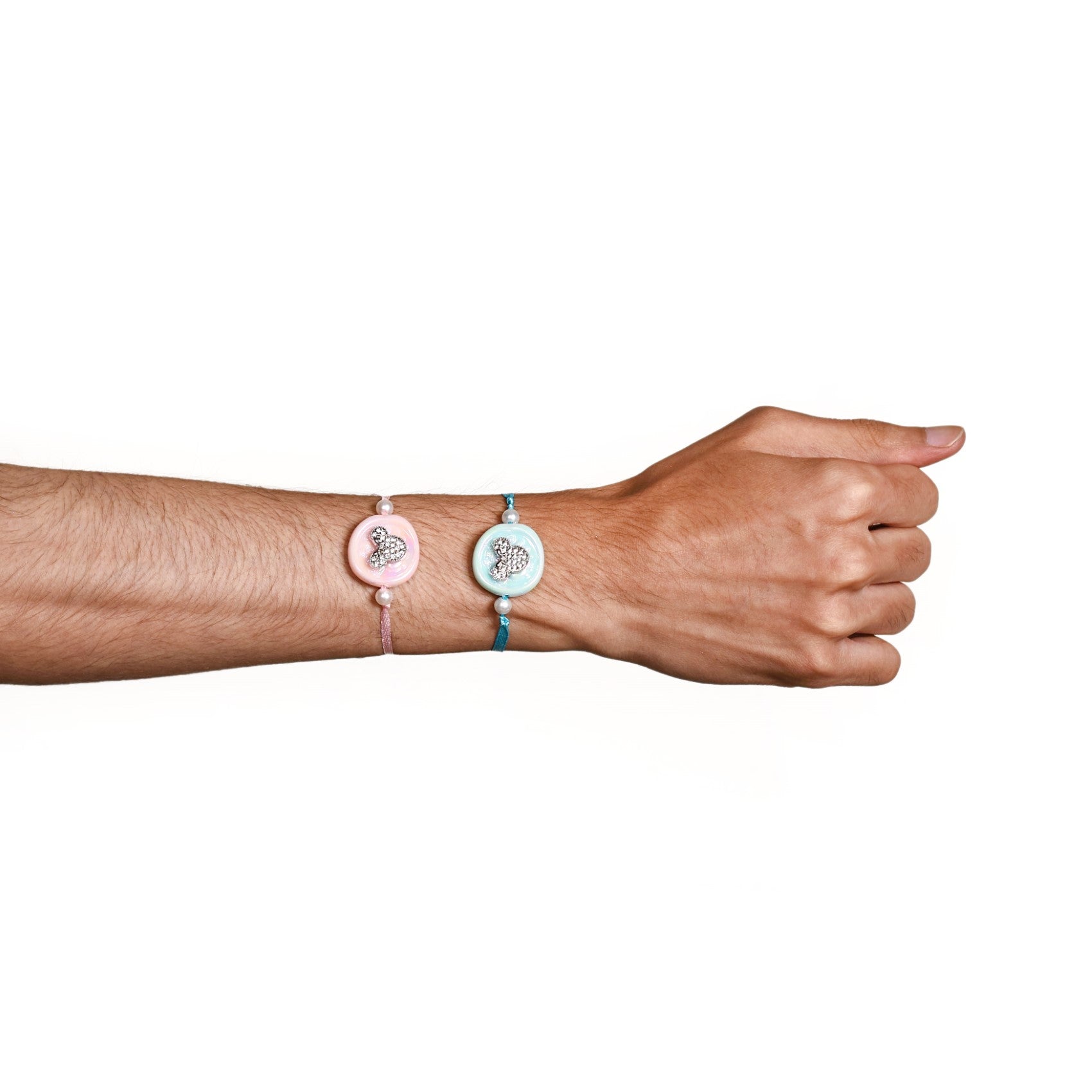 This stunning gift hamper houses a set of 2 Rakhis, one in a soft baby blue hue with a cute glossy charm that features an embossed bunny on one side, a crystal-studded Mini Mouse on the other side, and pearl embellishments. The other boasts a pretty pink hue, faux pearls, and a sparkly stone Mini Mouse. Complemented by a reusable roli-chawal set, a wish card, and a pack of dry fruits to make the little ones beam with joy, this lovely gift box is a great way to spoil your adorable siblings.