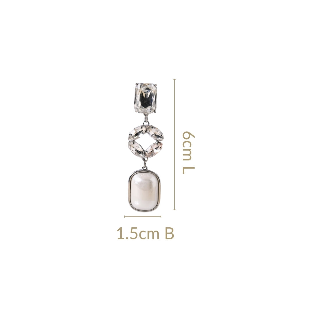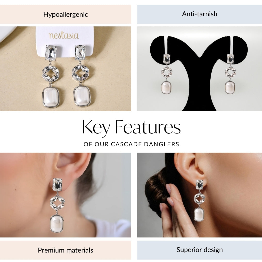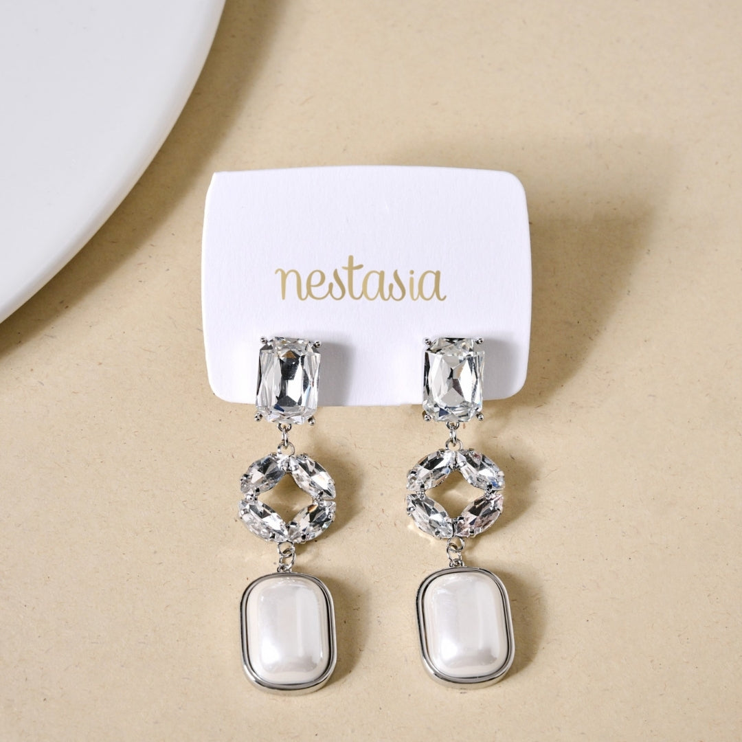 Delicate yet full of dimension, these silver-toned danglers bring layers of elegance to every look. The topmost piece sits gracefully on the lobe, featuring a sleek baguette-shaped diamond that catches the light effortlessly. Dangling below, a silver ring clasp suspends a stunning circular design formed by four leaf-like stones, adding a touch of nature-inspired beauty. The final layer? A luminous white PVC bead, bordered with polished silver metal, swaying gently with every move.