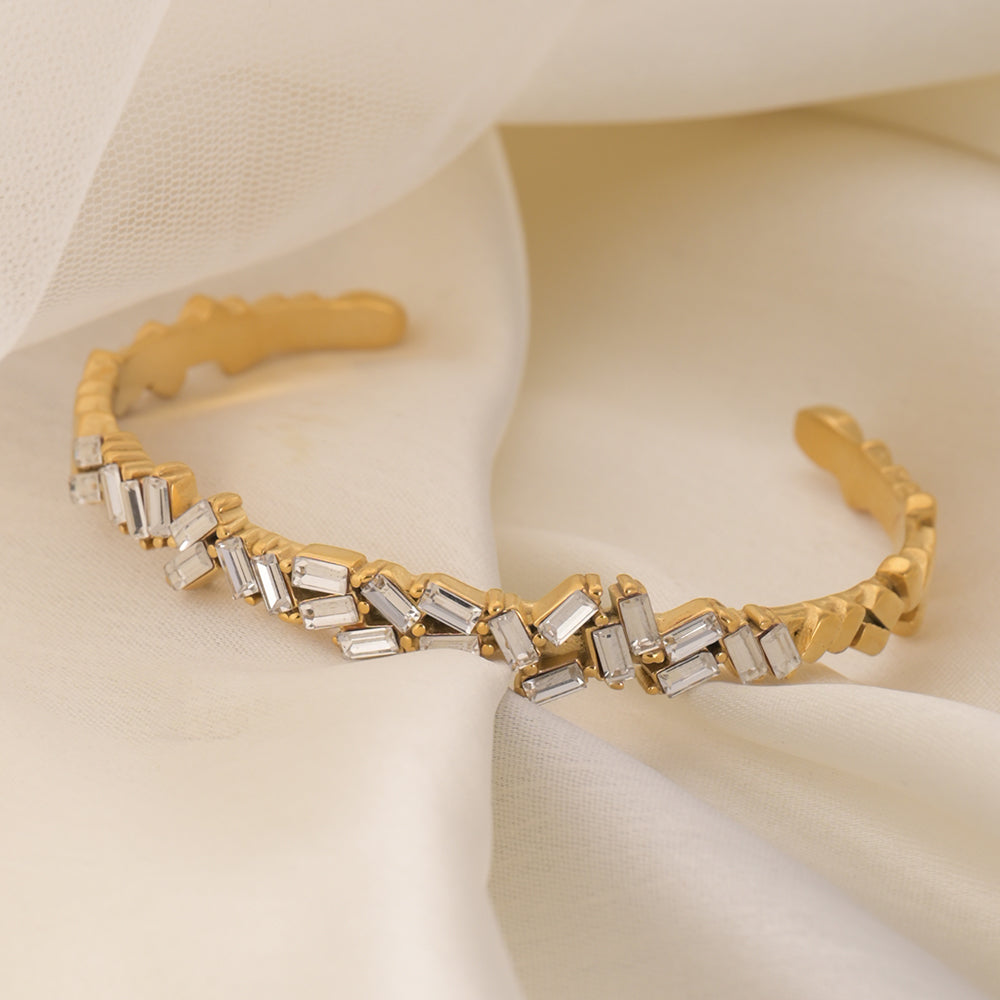 a radiant addition to our latest jewelry collection. Adorned with pristine symmetrical white crystals, this bracelet exudes modern sophistication. The intricate zigzag design symbolizes dynamic energy and style, making it a versatile statement piece for any occasion. Elevate your style with this exclusive piece from our new jewelry collection, a perfect embodiment of contemporary chic.