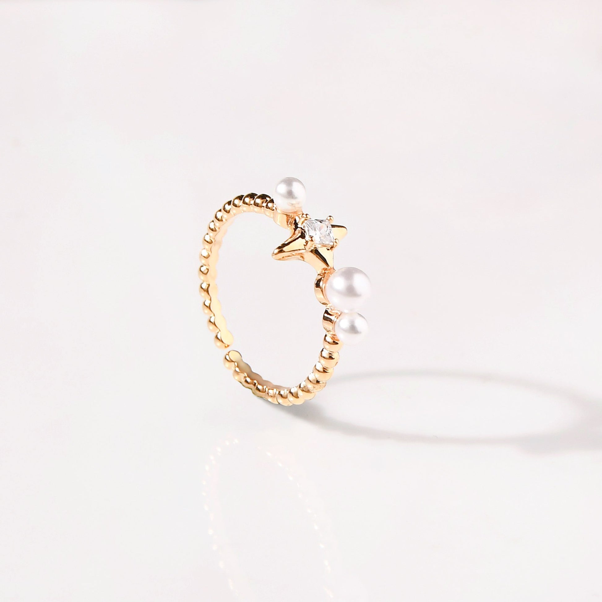 Crafted in lustrous gold, this exquisite ring features a band adorned with intricately textured beads, adding depth and sophistication to its design. At its heart lies a meticulously cut starburst motif, symbolising the brilliance of the cosmos. Crowning this centerpiece is a mesmerizing transparent gemstone, reminiscent of a shimmering star, exuding an ethereal iridescence that captures the light beautifully. Flanking the central gem, three luminous pearls are artfully positioned—two on the left and one on the right—adding a touch of classic elegance and balance to the piece.