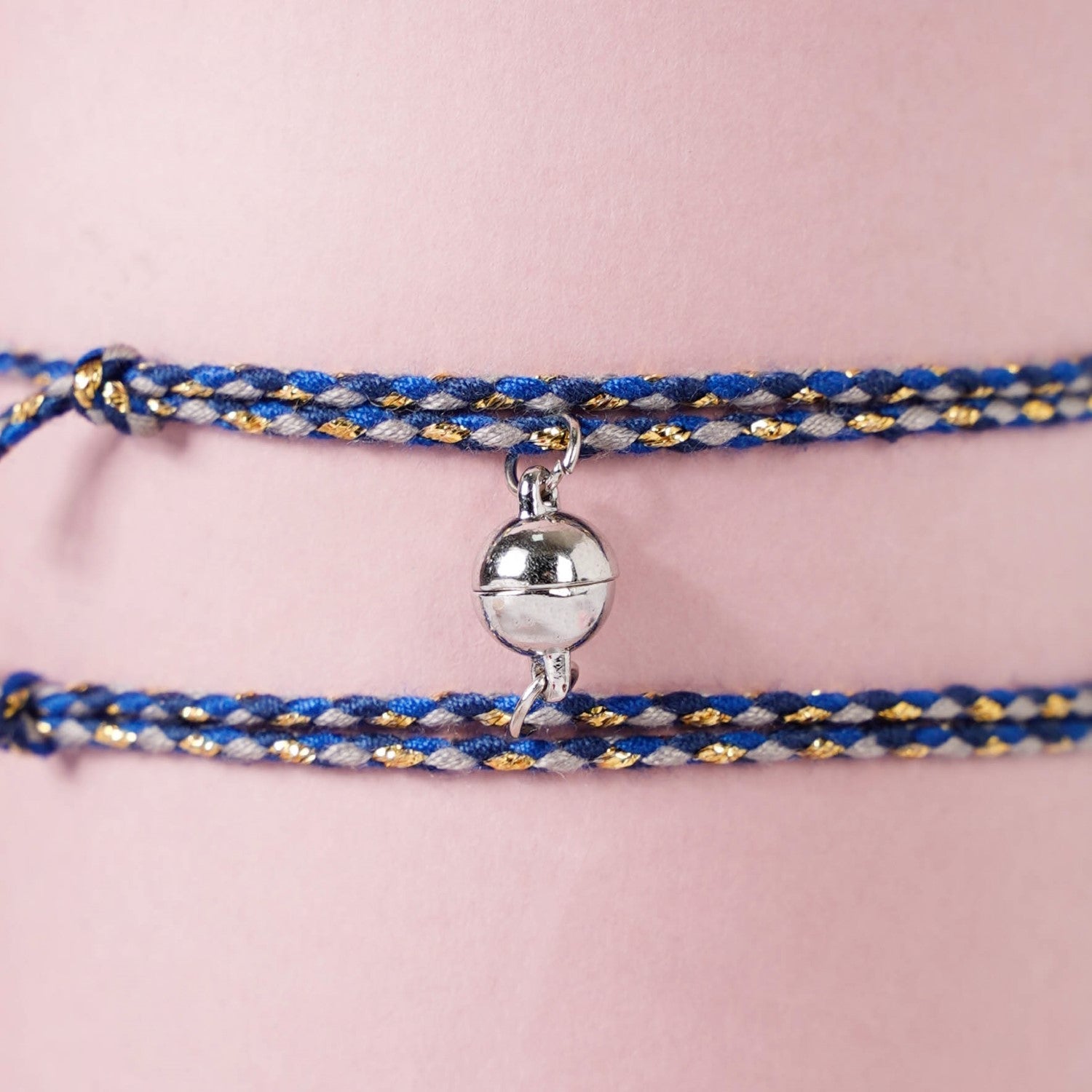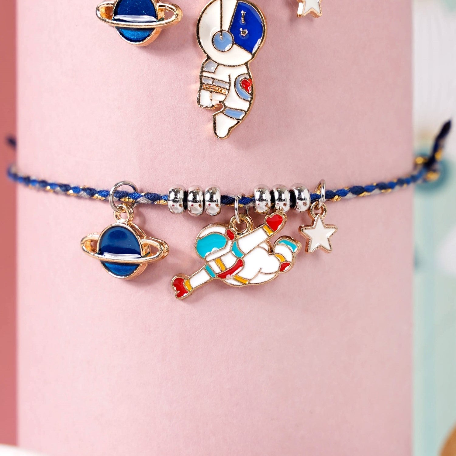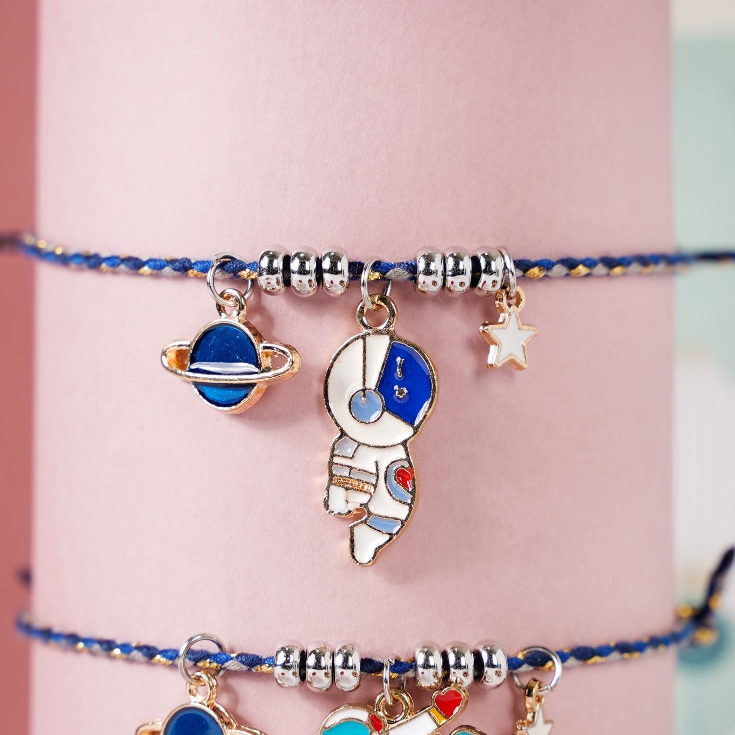 Let the little ones fly off to a world of imagination with our set of 2 charm bracelets for kids. Crafted to make the kiddos beam with joy, each bracelet is an expression of unfettered childhood fancies. The bracelets feature whimsical astronaut charms, both geared up in spacesuits. Complemented by ringed planets and stars, these bracelets will inspire your munchkins to seek out the awe-inspiring beauty of outer space. Equipped with a clever magnet mechanism that connects the accessories, these tie-up bracelets have been designed to intrigue the kids.