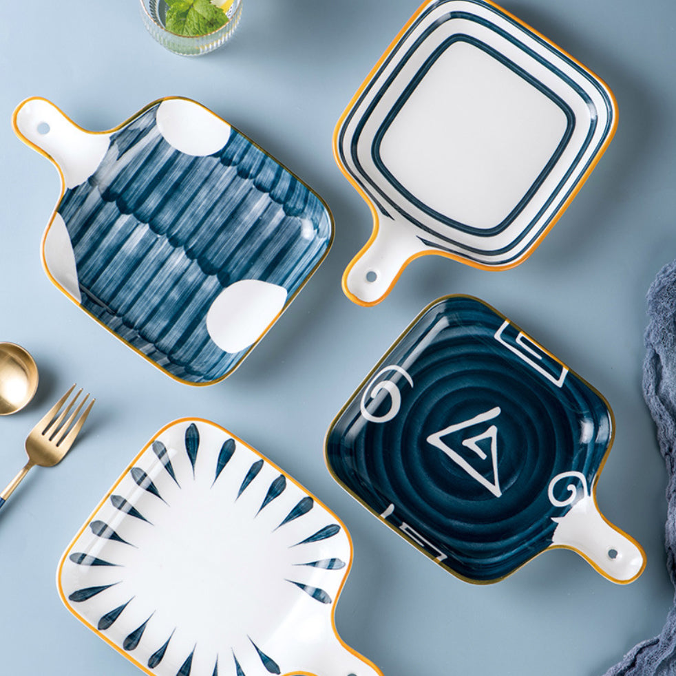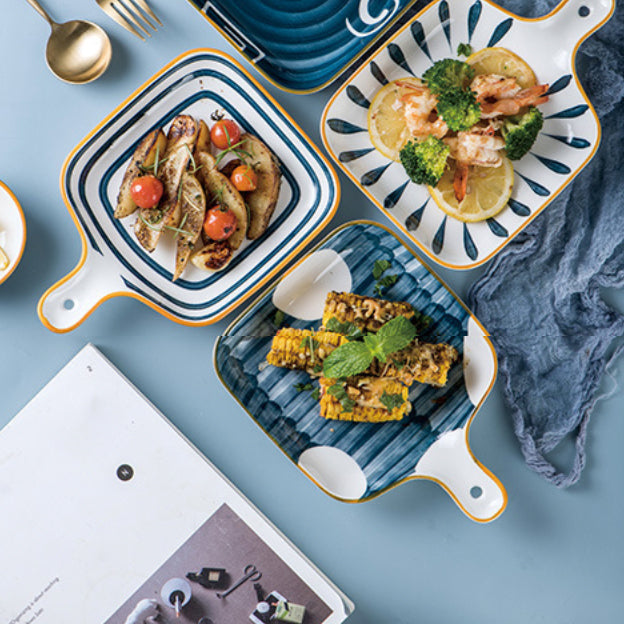 Ceramic plates with handle from the nitori collection come in four different variants and modern prints on them. The plates are apt for baking and grilling various food items. Available in multiple print patterns in blue and white, the baking plates can also be used for serving. The stylish plates can be easily stored due to their stackable nature. The platters can be used for baking pasta and grilling meat and vegetables.