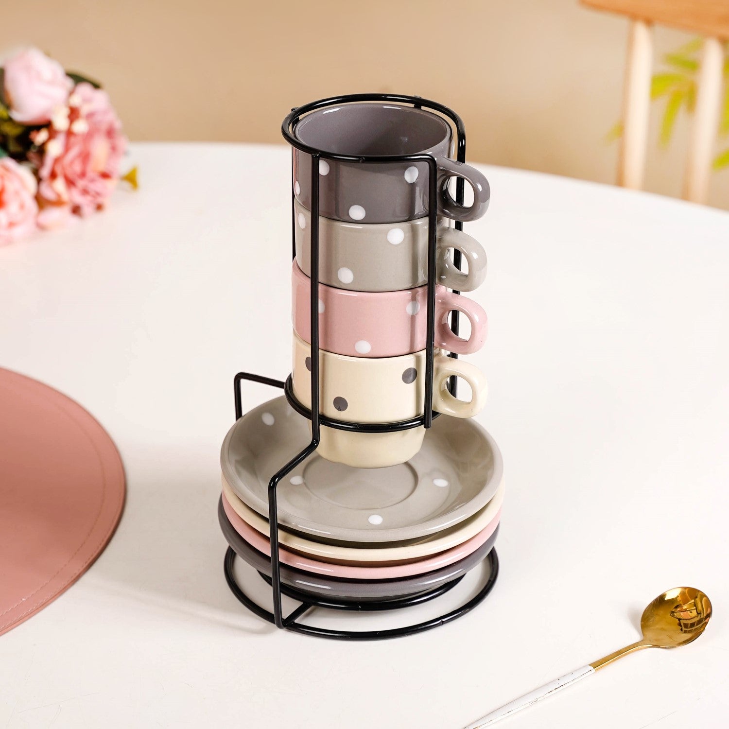 Ceramic Polka Dot Stackable Tea Cup And Saucer Set Of 4 90ml