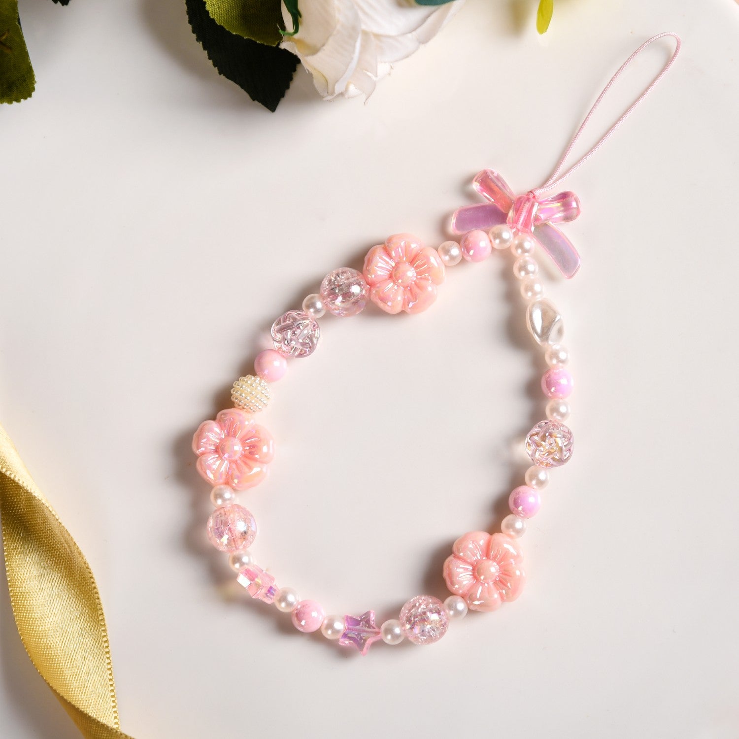 Add a sparkly charm to your phone with this delightful pink-themed accessory. Crafted with a durable polyester pink thread, this phone lanyard features a mix of faux pearls in round shapes and larger ones for added texture. Translucent and baby pink beads are beautifully complemented by big pink flowers, creating a whimsical and feminine design.
