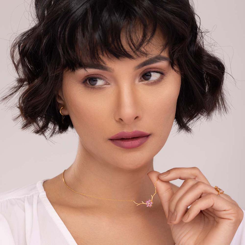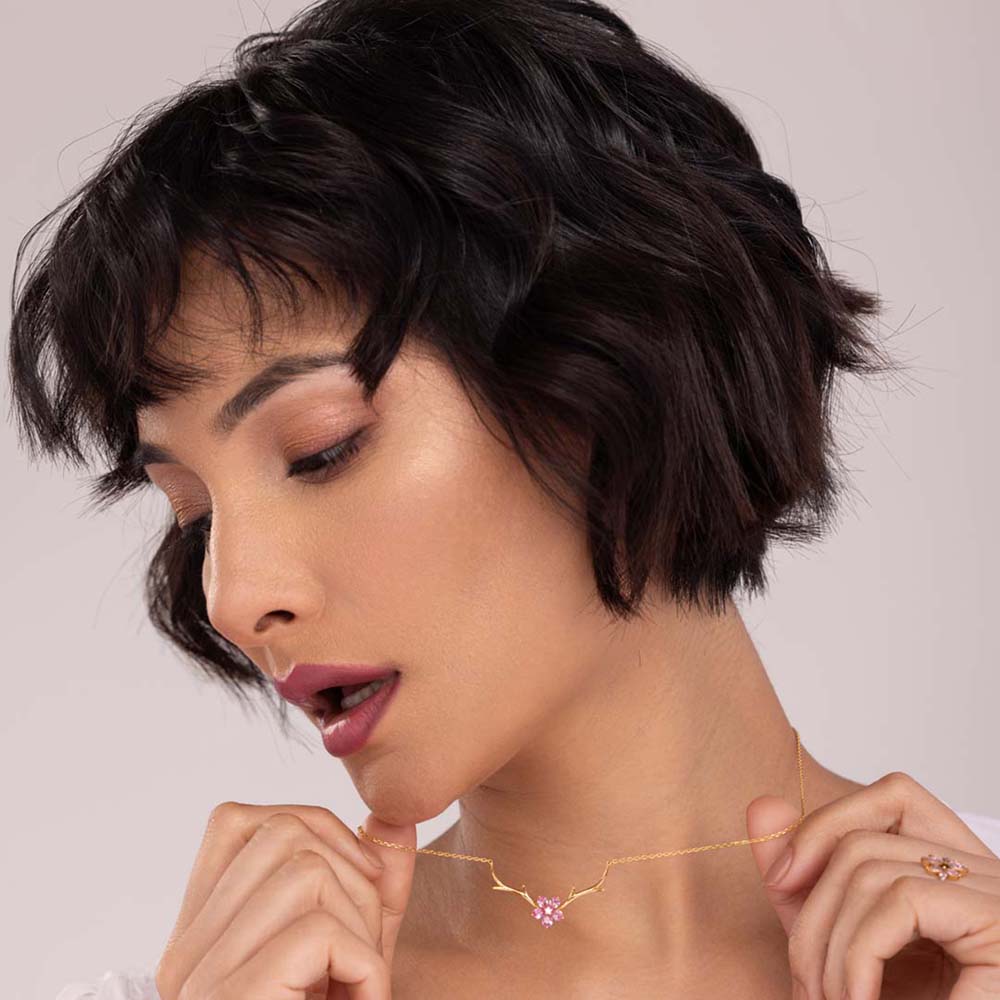 The Cherry Flower Necklace features delicate pink and white cubic zirconia blossoms on a radiant 18k gold-tone chain, evoking feminine charm and elegance. Crafted in stainless steel with a waterproof and anti-tarnish finish, this necklace adds a playful yet sophisticated accent to casual, office, or evening outfits, making it perfect for everyday wear or special occasions.