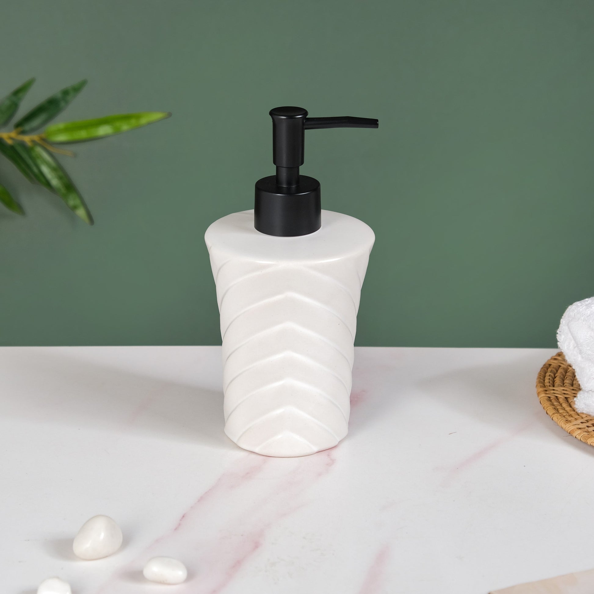Enhance your decor with our premium ceramic soap dispenser, featuring a zigzag textured design and a chic matte finish. Made from durable ceramic material, this refillable handwash dispenser is expertly crafted for lasting quality. Perfect for dispensing a range of toiletries from shampoo to body wash, this modern bath dispenser is perfect to add an artistic flair to your bathroom. The easy-to-pump nozzle of this liquid dispenser ensures smooth and effortless soap dispensing, perfectly combining style and functionality for the modern home. The ceramic dispenser is durable and easy to clean.