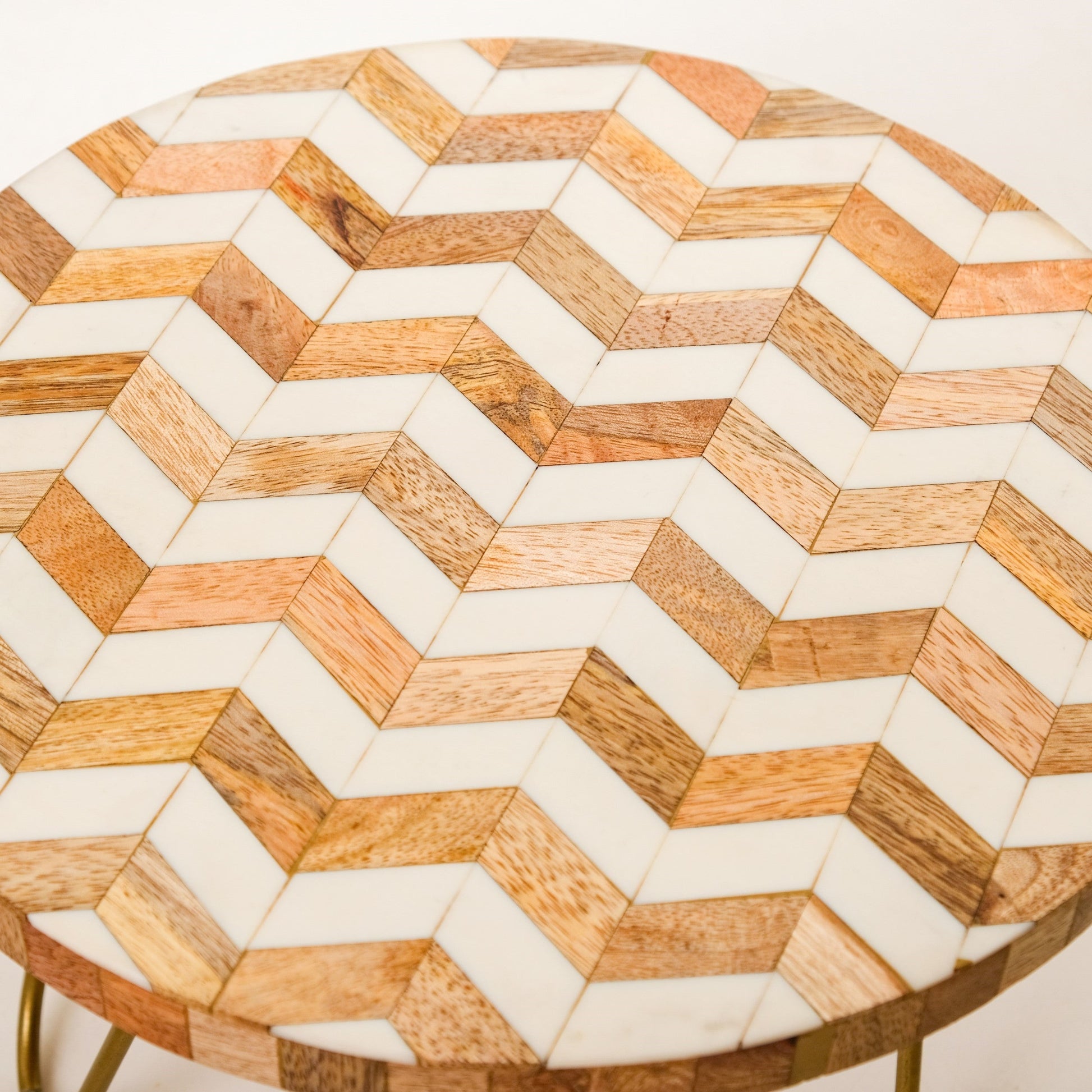 Design: Crafted from mango wood and resin, this round riser platter features a striking chevron mosaic in brown and ivory tones. Its surface combines smooth and textured finishes, highlighting the interplay of wood and resin. Three sleek golden metal legs in a looped U-shape lift the platter, adding elegance and visual interest.