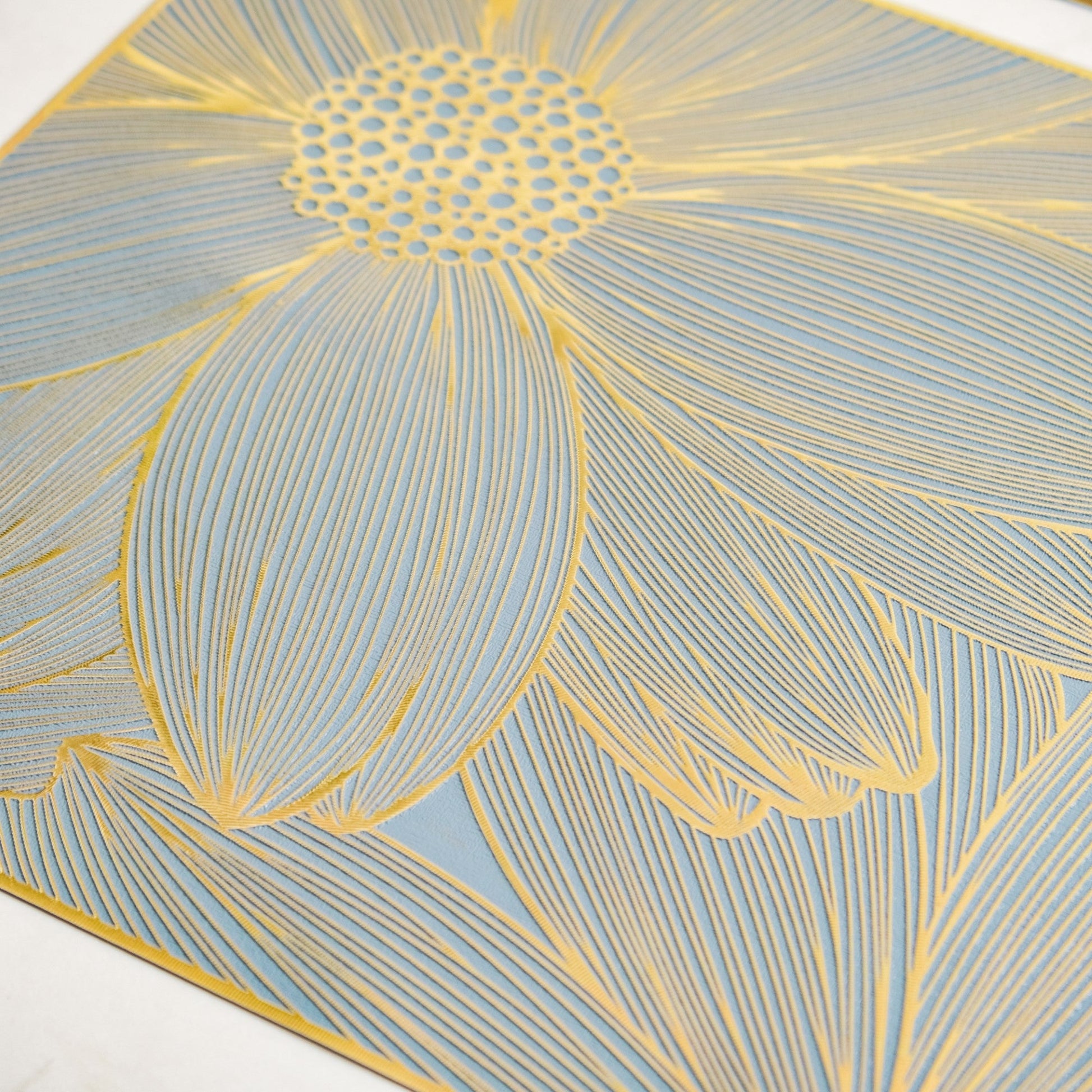 Design: These rectangular table mats bring a refined aura to your daily dining experience and add a spark to your home celebrations. Designed to leave a stunning impression, their bold floral patterns in golden accents look breathtaking no matter where they are placed. The grey-blue base lets the gold hue pop and add drama. The delicate petal lines and textured centre of the blooms add depth to the design and make the mats eye-catching.