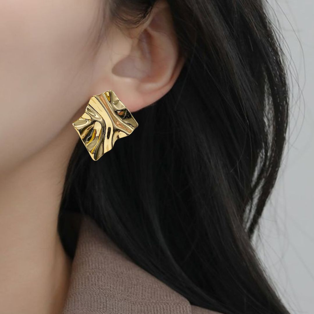 A true masterpiece of modern design, these statement stud earrings exude both strength and grace. Inspired by the raw beauty of industrial metalwork, they capture the strength of sculpted metal in its purest form, bent and hammered to create soft, flowing waves. The gold-tone finish adds a timeless touch, while the abstract rectangular shape brings an edge of contemporary sophistication. Designed to make a statement, these earrings seamlessly blend boldness with femininity, offering a striking balance of power and elegance.