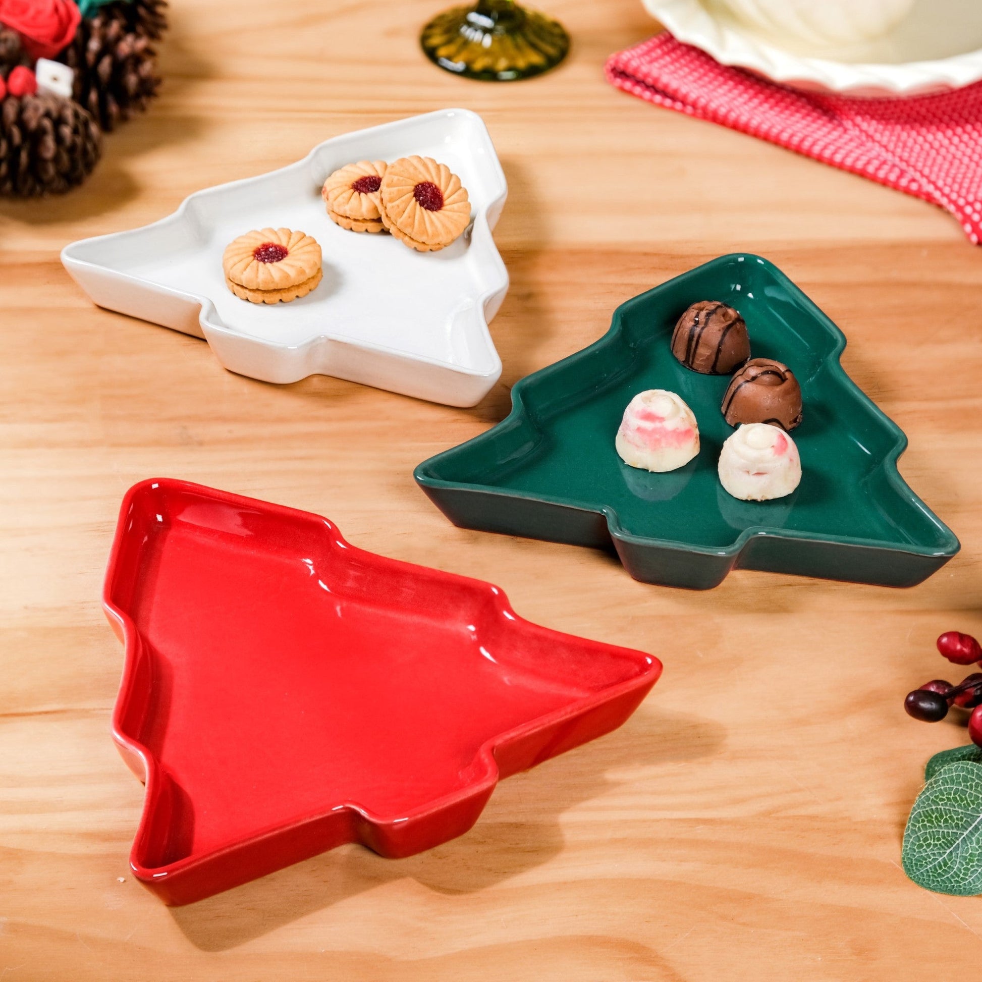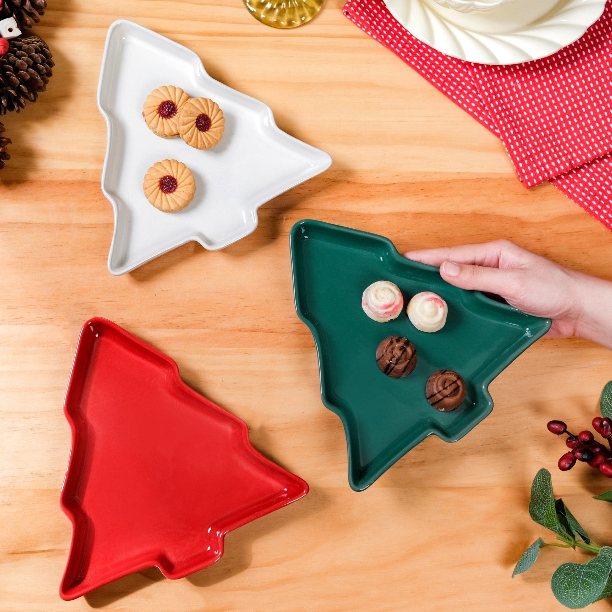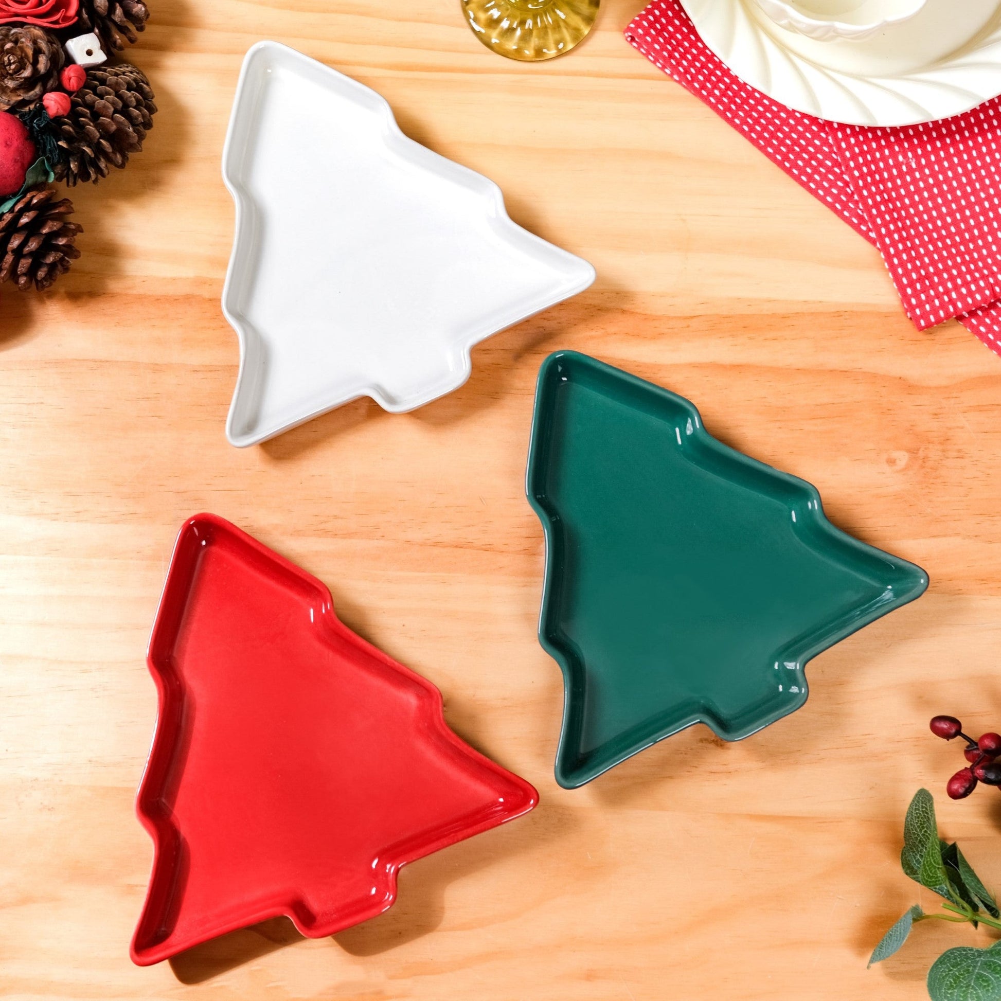 Design: Featured in white, green, and red, each ceramic snack plate features a whimsical Christmas tree shape. Complemented by a glossy finish for a touch of refinement, the charming snack plates are perfect for various occasions.
