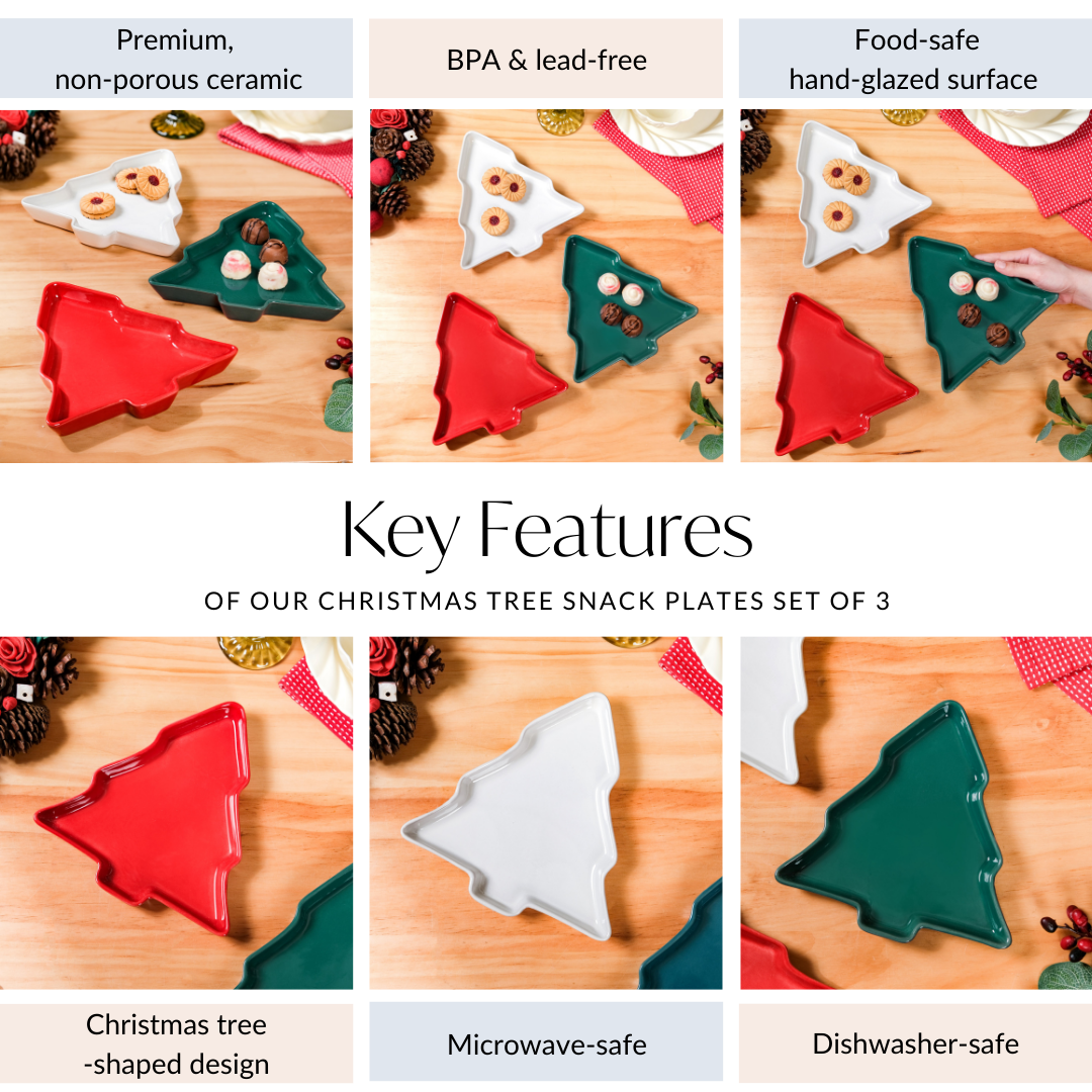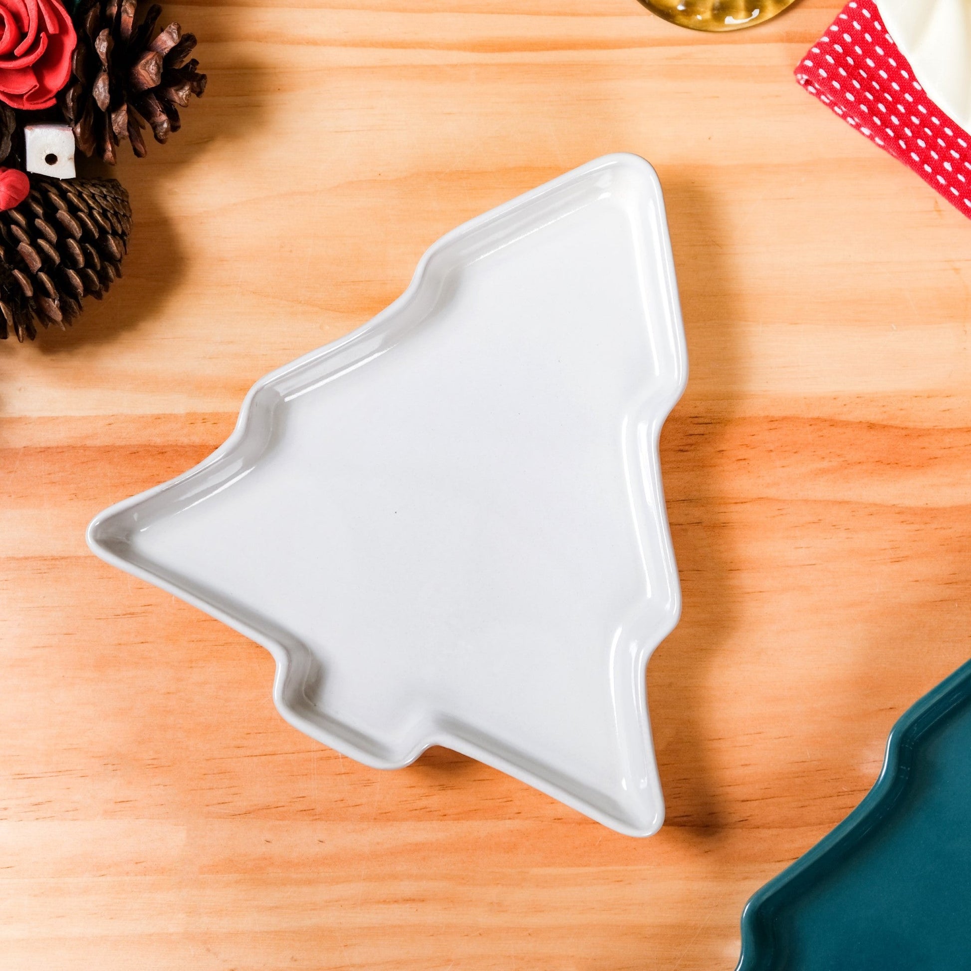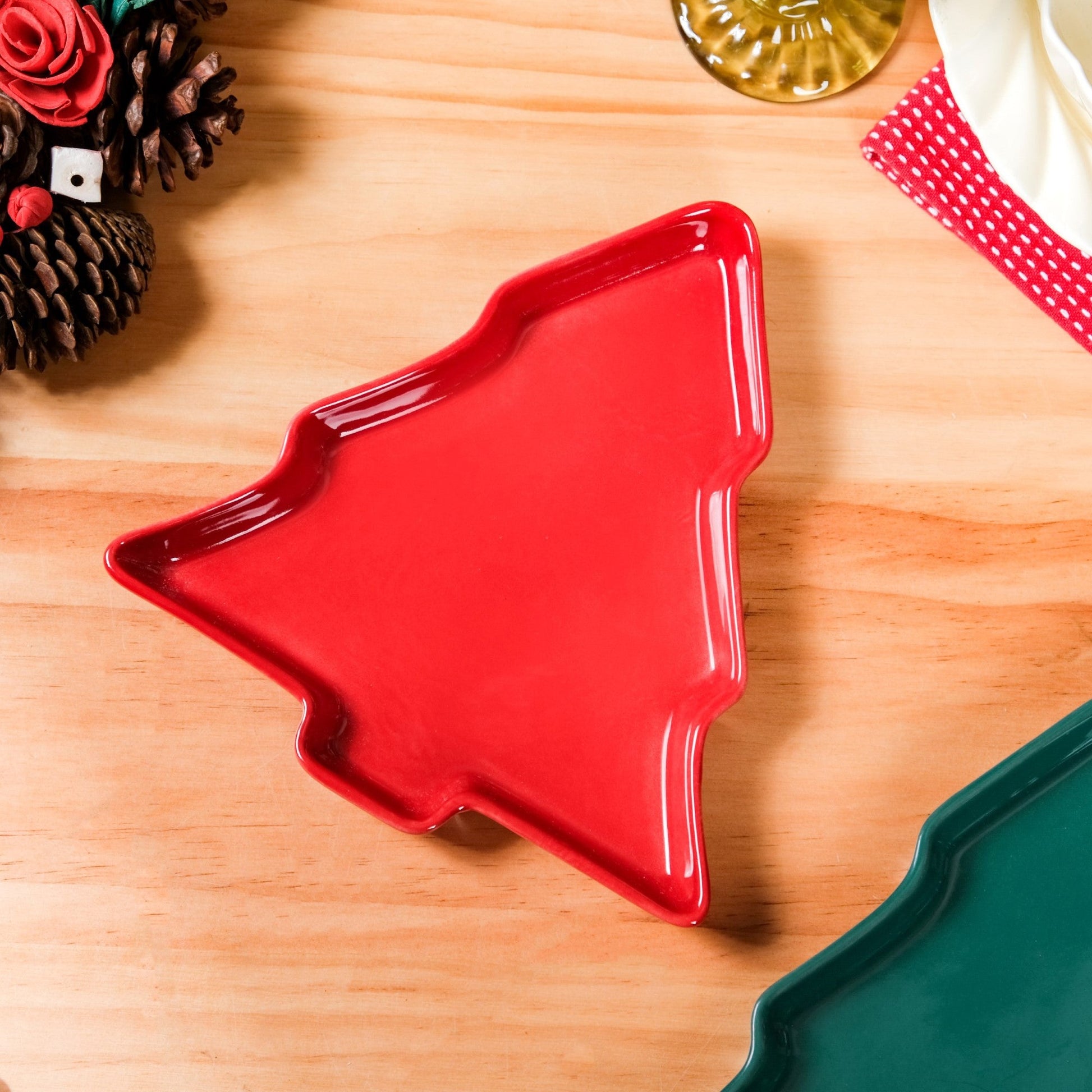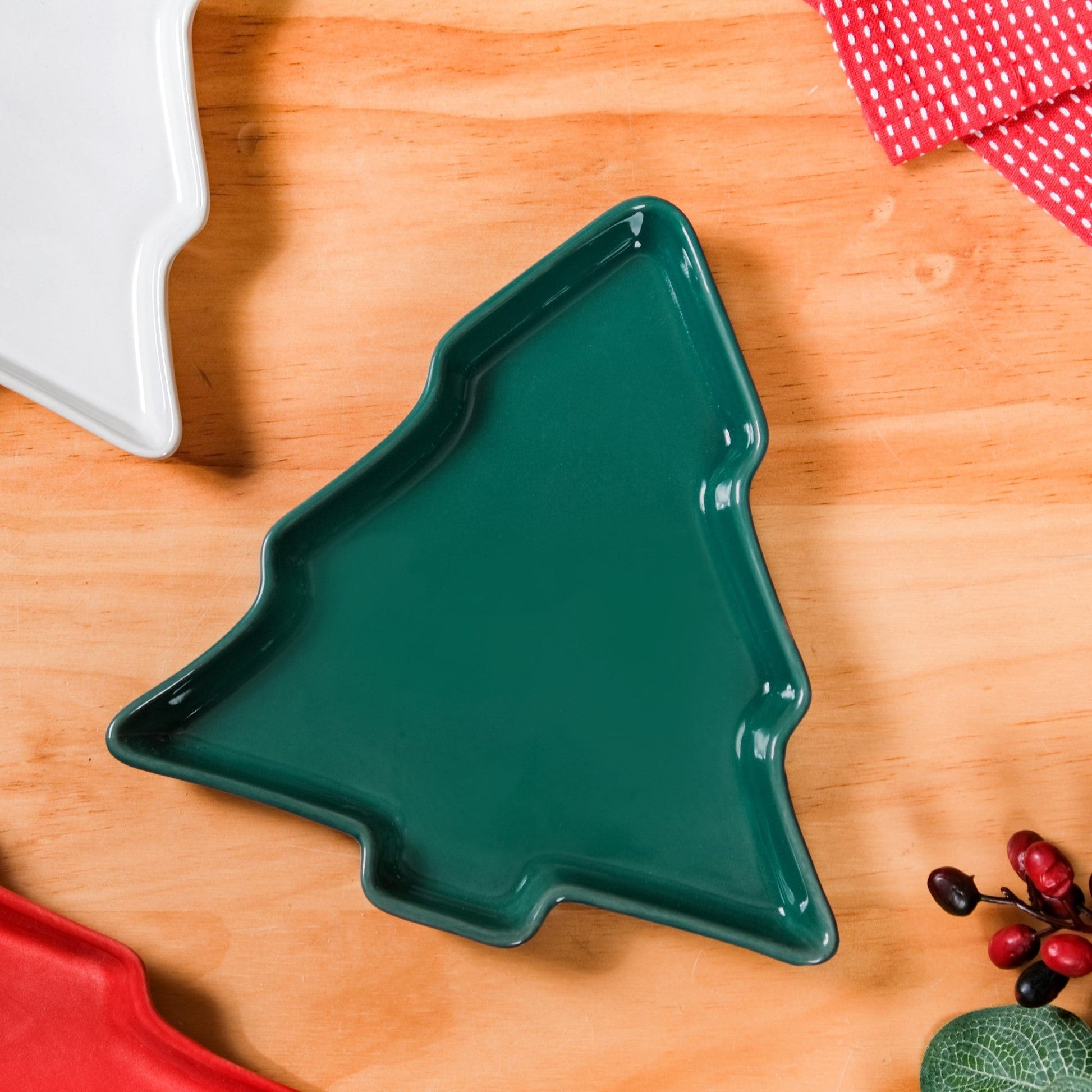 Design: Featured in white, green, and red, each ceramic snack plate features a whimsical Christmas tree shape. Complemented by a glossy finish for a touch of refinement, the charming snack plates are perfect for various occasions.