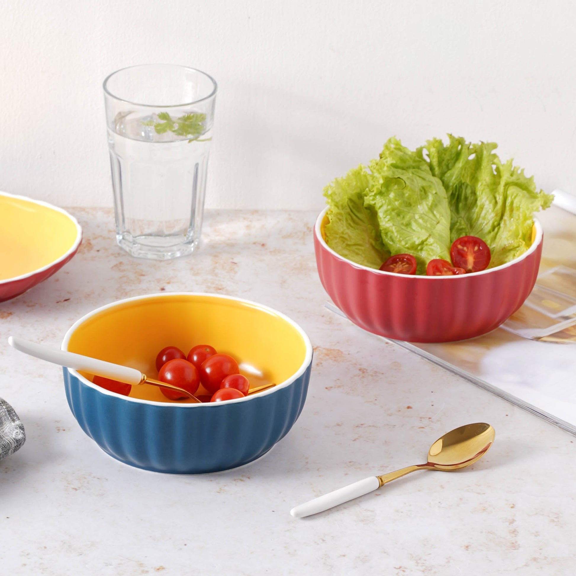 The dual toned salad bowls made of ceramic have finely textured lines on the surface are from the Chrome collection. The bowls can be used to serve lentil, porridge and delicious homemade curries. The ceramic bowls can also be used as noodle bowl, fruit bowl and salad bowl. Purchasable in 2 colour variants the yellow bowls can brighten up a serving.