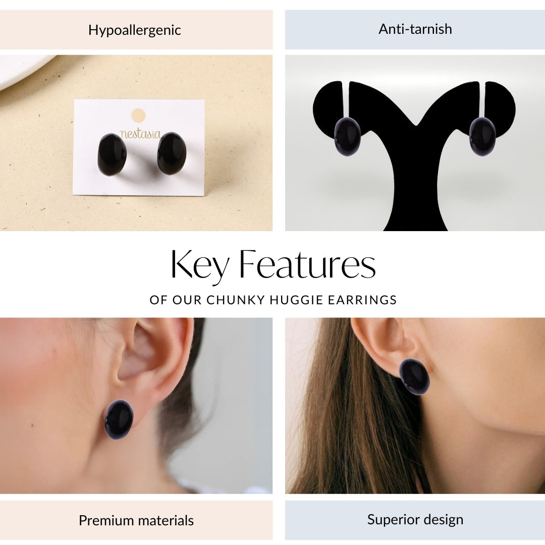 Effortlessly chic and undeniably bold, these chunky huggie earrings are a statement of modern elegance. Inspired by the beauty of minimalism, they embrace clean lines and a sleek silhouette that speaks volumes without saying a word. The deep black hue enhances their striking presence, while the smooth, polished finish adds a refined touch. Whether worn solo or stacked, these earrings are the perfect balance of sophistication and edge.