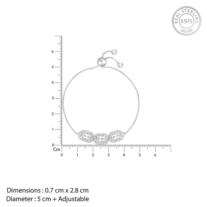 This silver bracelet has three rectangular-shaped cut zircons in the centre adorned with zircons.