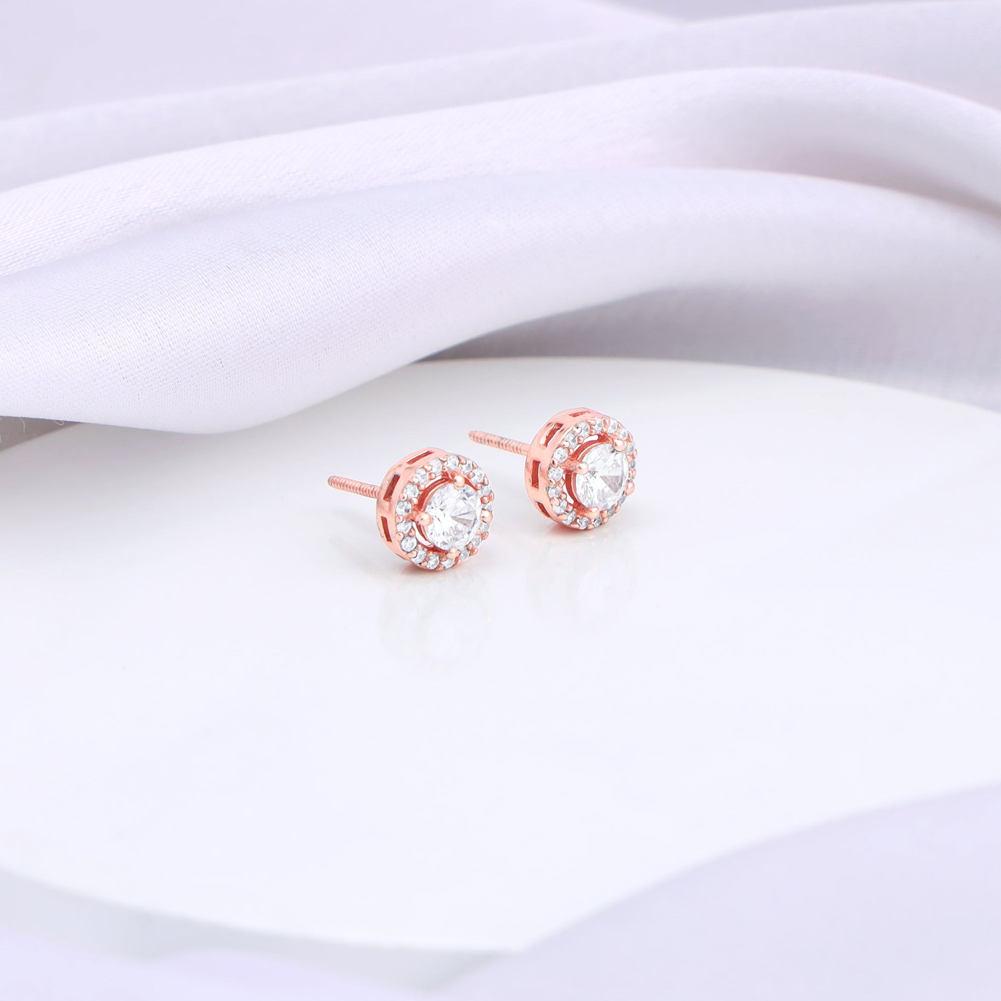 The Rose Gold Seeking Solace Stud Earrings have a solitaire style with zircons all over.