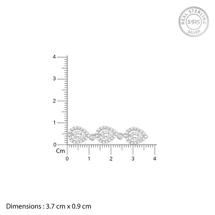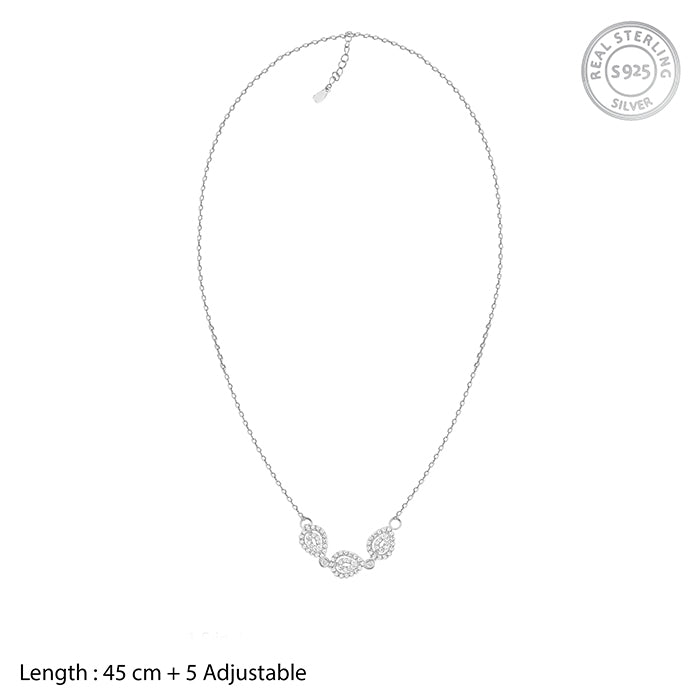 The silver necklace has three pear-shaped structures joined together with round zircon studded shapes in between.