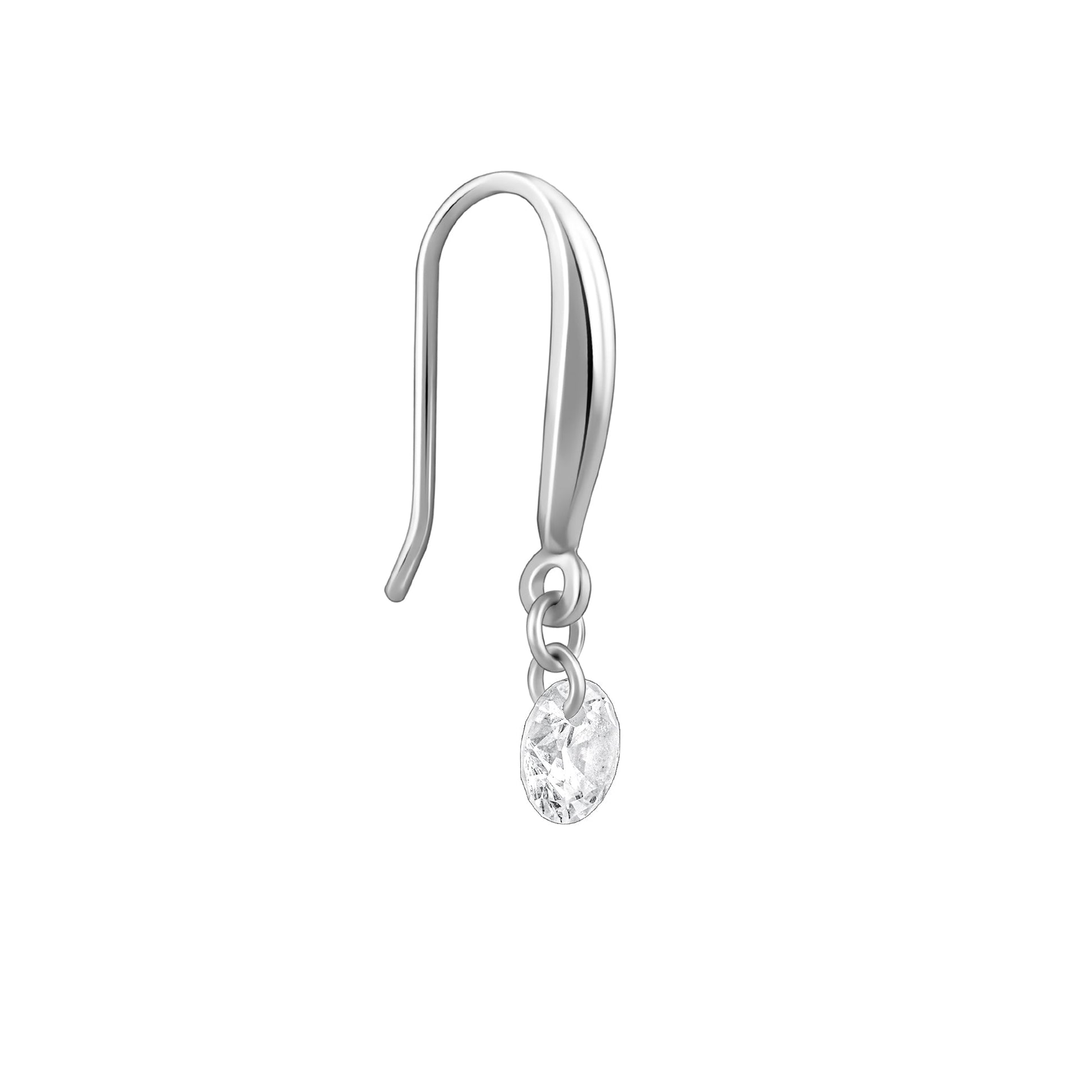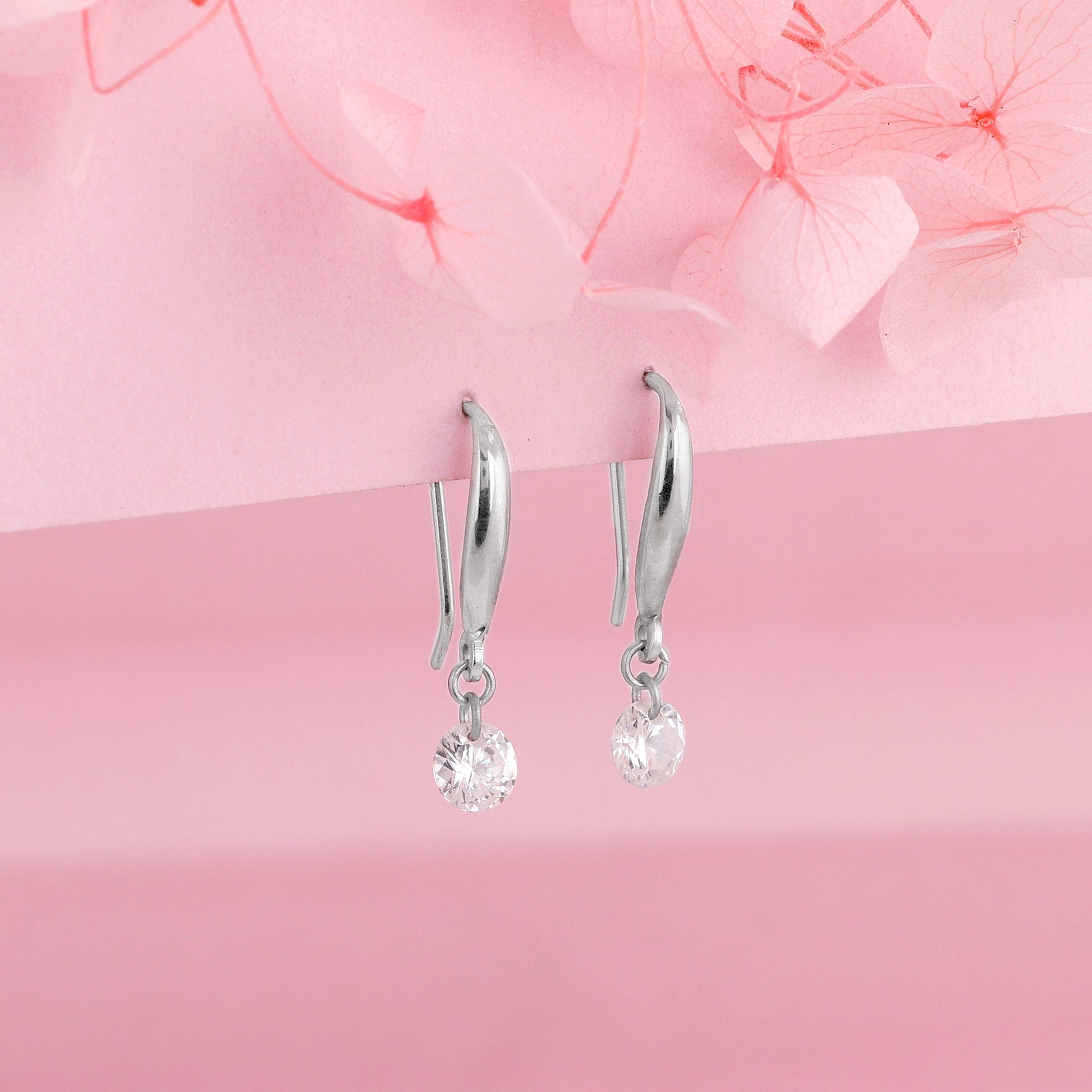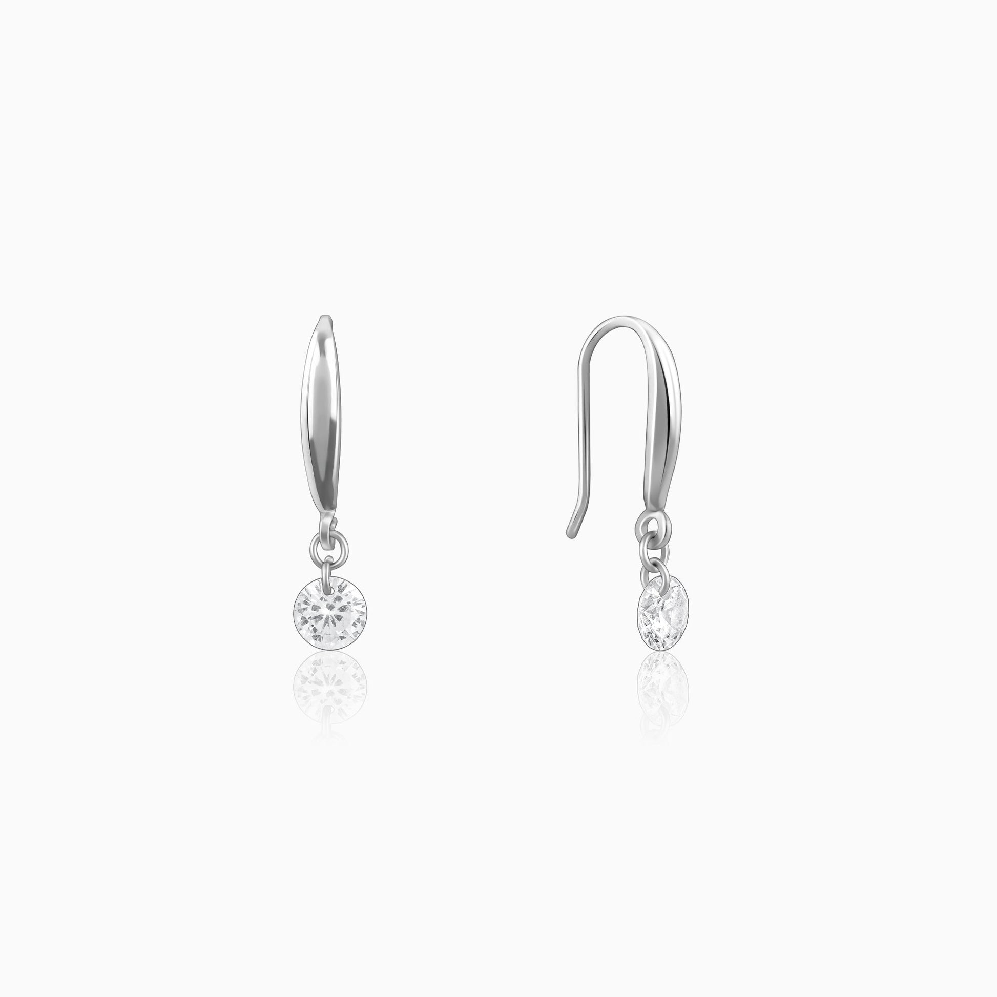 These silver earrings feature a circular motif dropping from a half hoop, both studded with zircons.