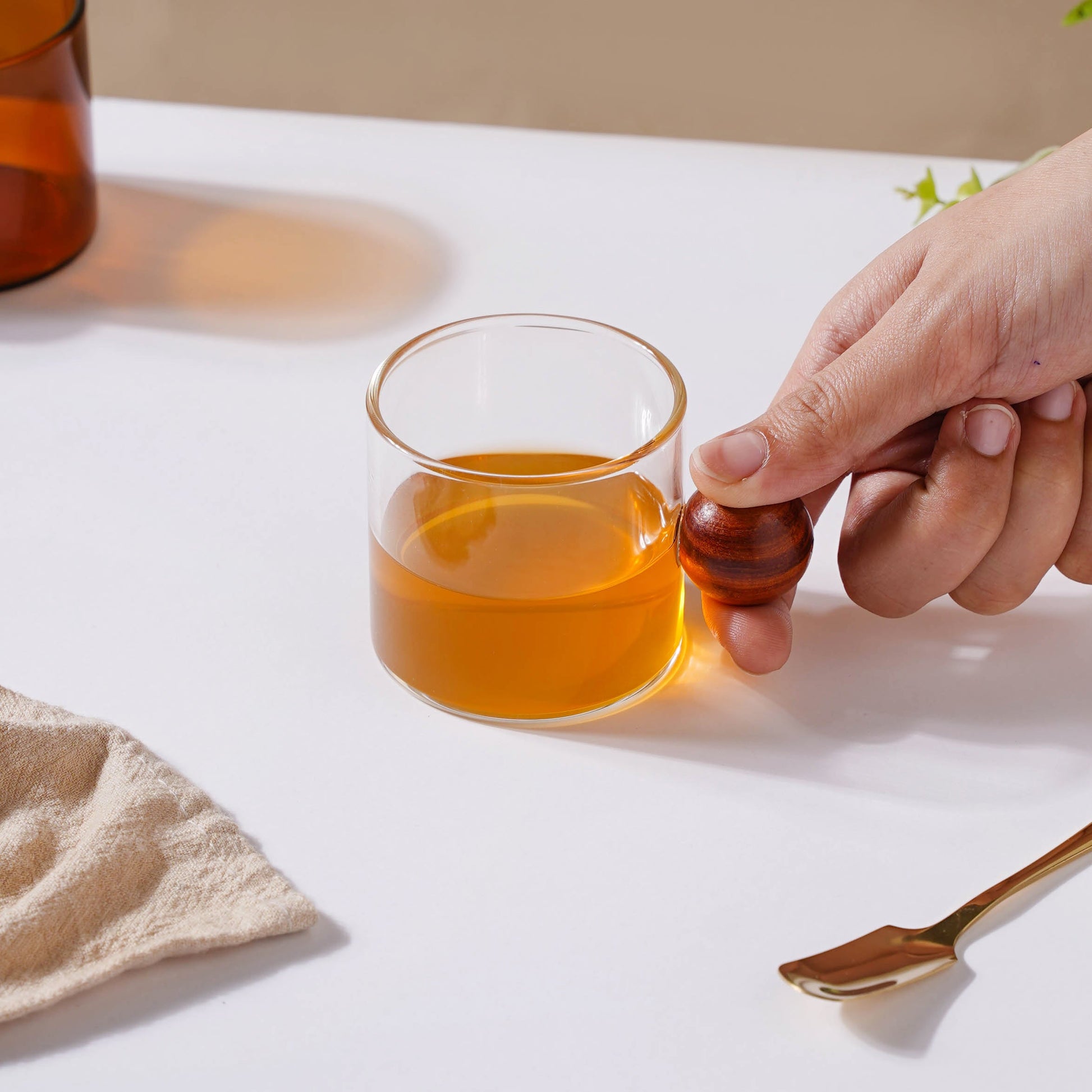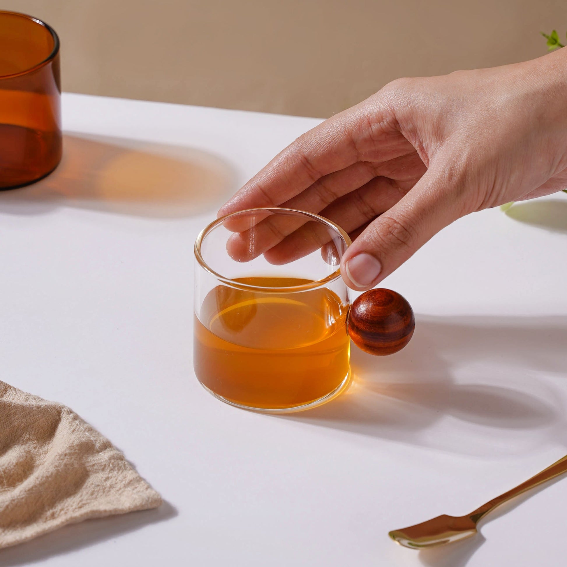 A mug perfect for all sips throughout the day! The spherical wooden handle on the cup is made to go with any home or kitchen decor style. While the glass is smooth to touch, the wooden handle is rustic and provides an abundance of texture to any design, making the cup one-of-a-kind and a wonderful addition to any house. The thick glass construction of the mug gives its design increased strength, making it durable, supported by a perfect sturdy wooden handle. Suitable for coffee, tea, and various other beverages, the modern cup with a wooden handle brings a fusion of contemporary and glam styles to the table. Easily adaptable into formal and informal setups, the cup can be paired with both neutral-hued as well as colorful snack sets.