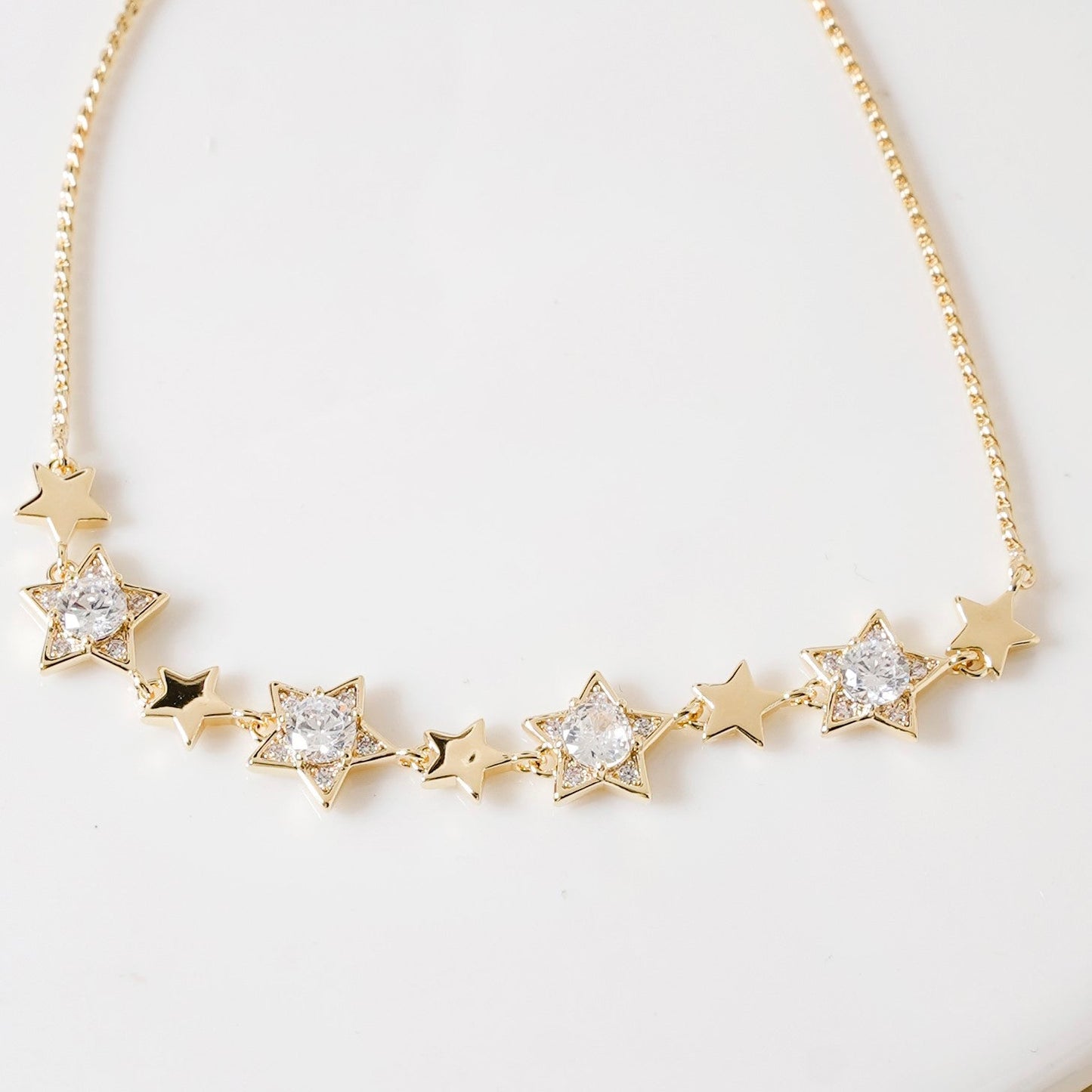 Stars on your wrist, sparkle in your stride - let your style shine with this gold-toned metal chain bracelet. Delicately adorned with star charms, it brings a touch of celestial elegance to any look. The larger stars twinkle with round-cut sparkling stones, catching the light beautifully with every movement. Designed for comfort and effortless charm, the lightweight chain drapes gracefully, making it perfect for both everyday wear and special occasions. Whether worn solo for a minimalist statement or layered for added brilliance, this charm bracelet is a dreamy addition to any accessory collection.