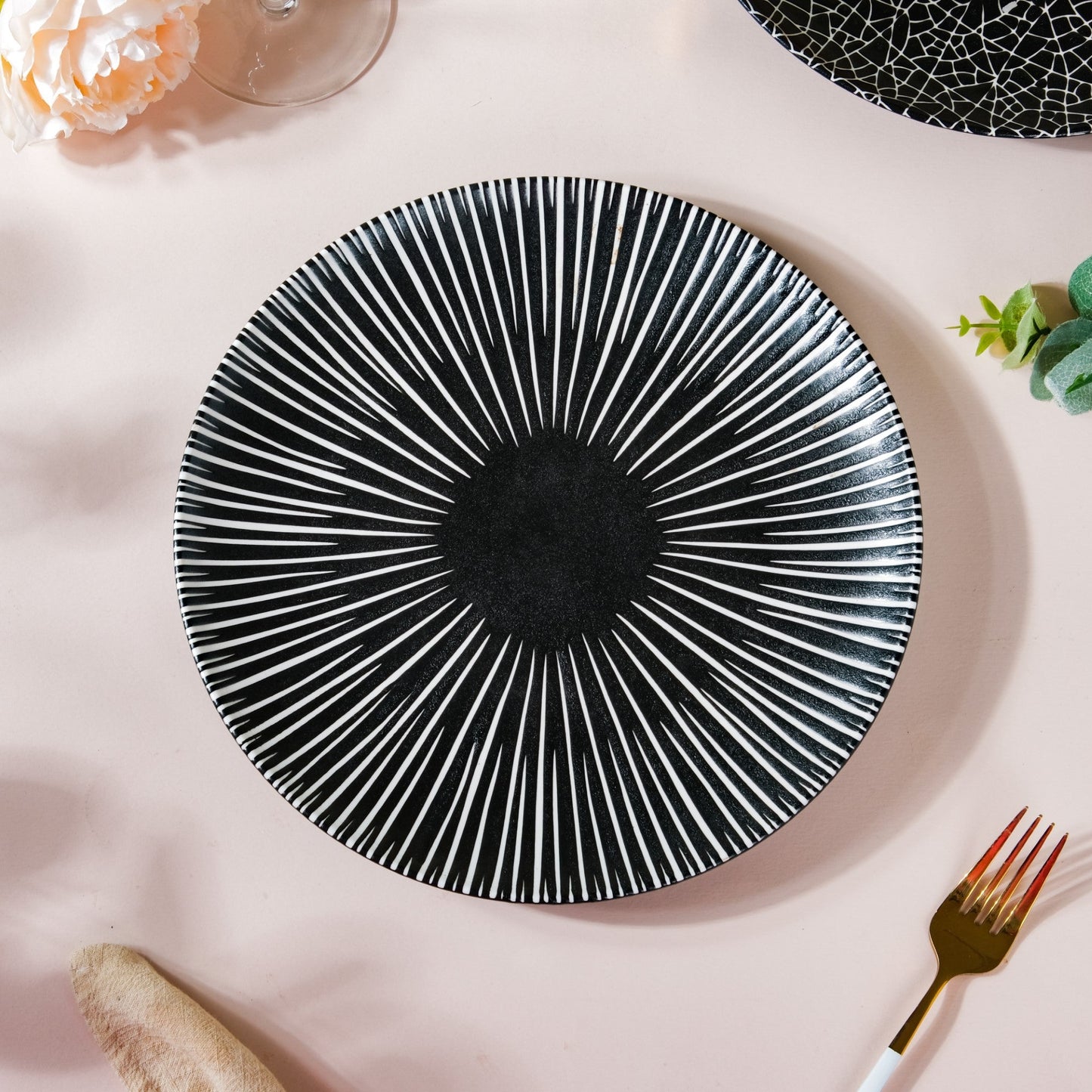 The sleek black dinner plate features a matte finish and looks extremely luxe on the dinner table. The white linear patterns on the ceramic plate contrast beautifully against the dark surface of the dinner plate. Crafted of high-quality ceramic, the dinner plate is ideal for serving main course meals during lunch or dinner.