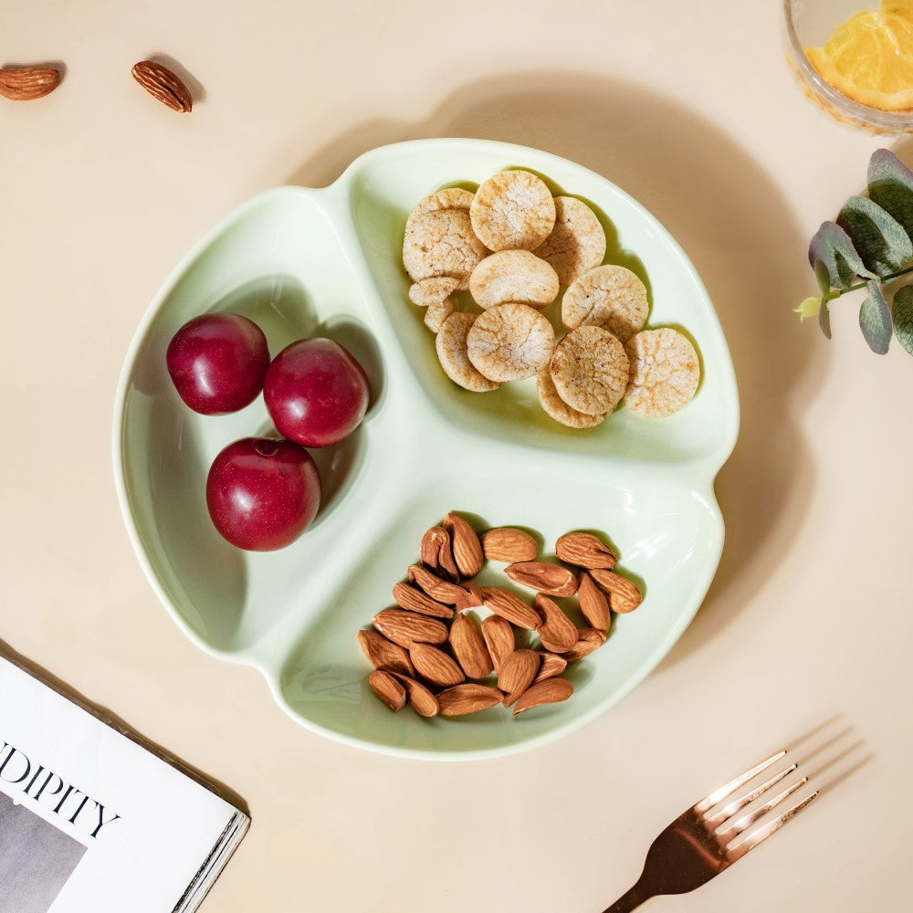 Green-colored ceramic circular section plates with three divisions are available for purchase. The segment plates may be used as snack or dinner plates. The divides on the plates make it simple to eat without needing to use bowls. The divisions protect the food from leaking or contaminating one another.