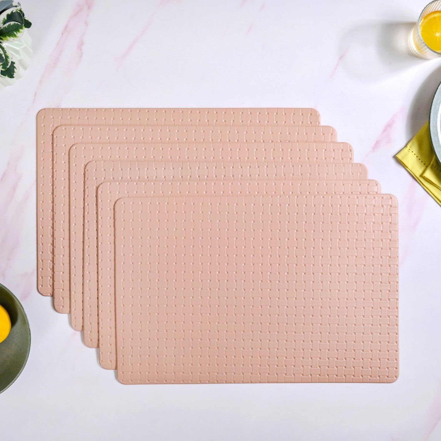 Design: Crafted from durable PVC, this set of 6 placemats features a thick, rectangular shape with a bold basket weave pattern. The vibrant coral peach hue brings warmth to your table setting, while the reversible design lets you use it for longer. The mats are sized to fit a full place setting comfortably.