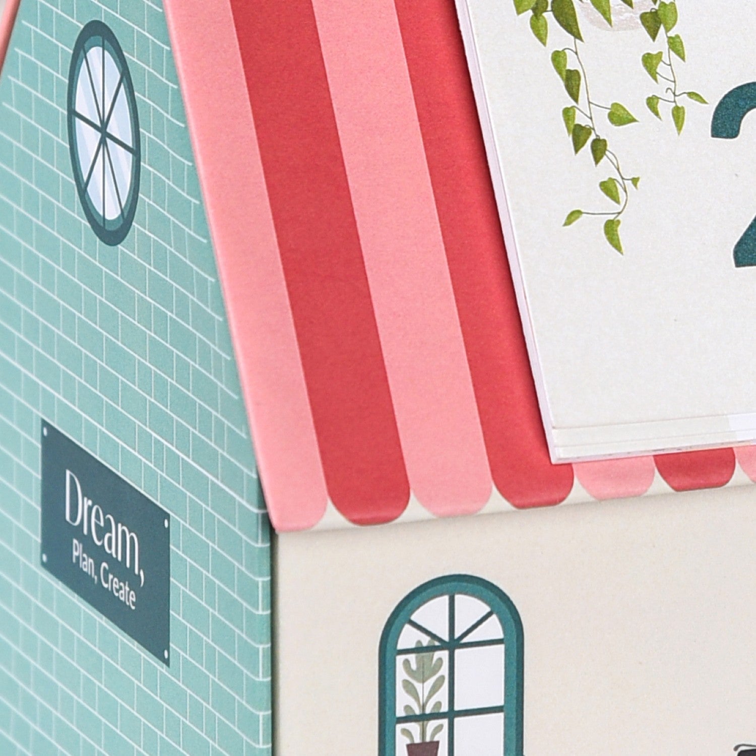 Rich with personality, the roof is patterned with soft red and pink stripes, while the mint green brick walls on either side are accented with round windows. At the front, a small doorway is framed by potted plants, with a Vespa parked just outside. The back reveals a peaceful park scene, perfectly capturing the essence of the European countryside.