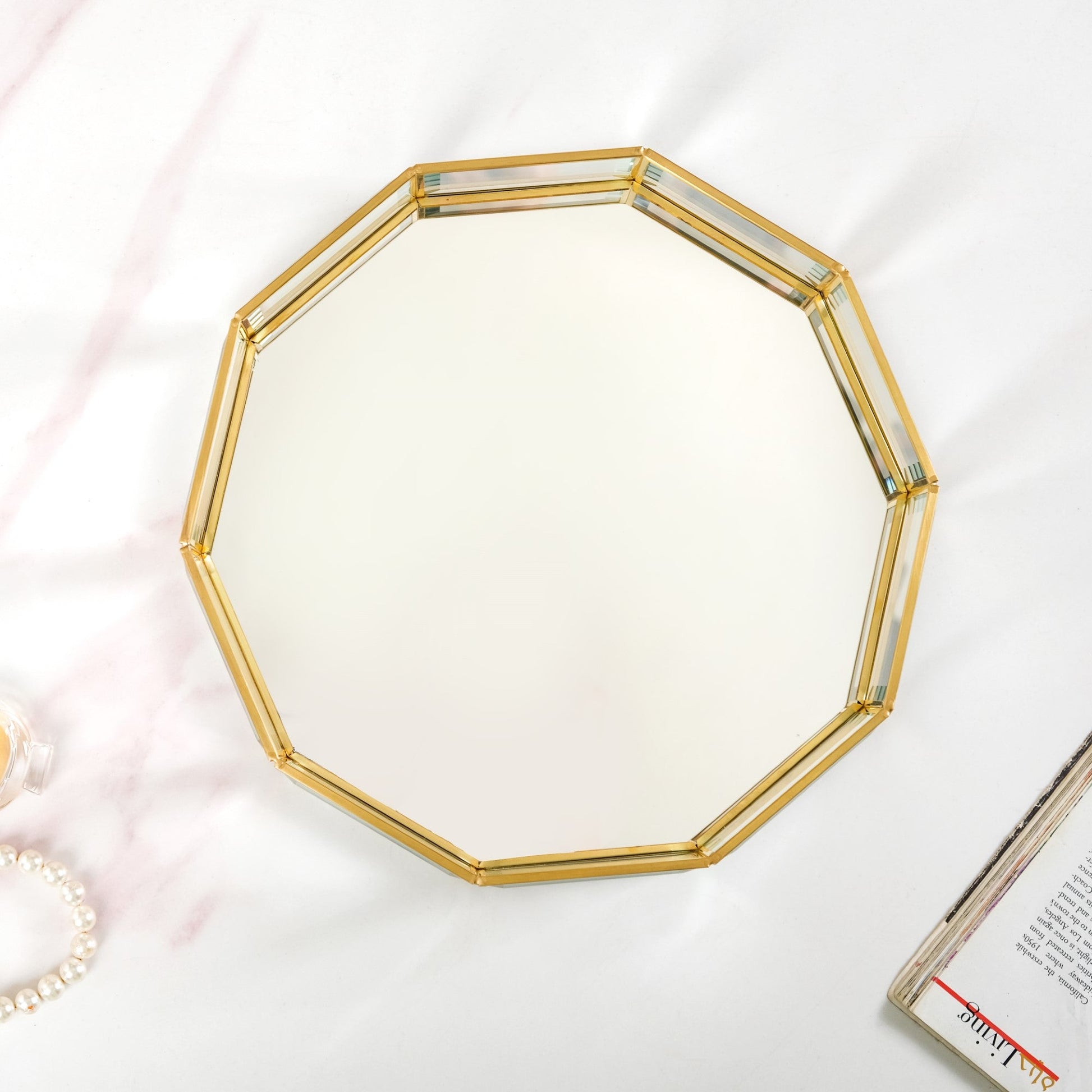 Design: Fashioned from premium-quality tempered glass and encased in a rust-resistant opulent golden metal frame that has been skillfully set by hand, the vanity tray is the epitome of modern sophistication. Boasting a decagon shape with bevelled glass sides and an anti-glare mirrored base, this trinket tray is just what you need. The anti-skid foaming padding at the base provides added protection, making this gorgeous tray both aesthetic and functional.