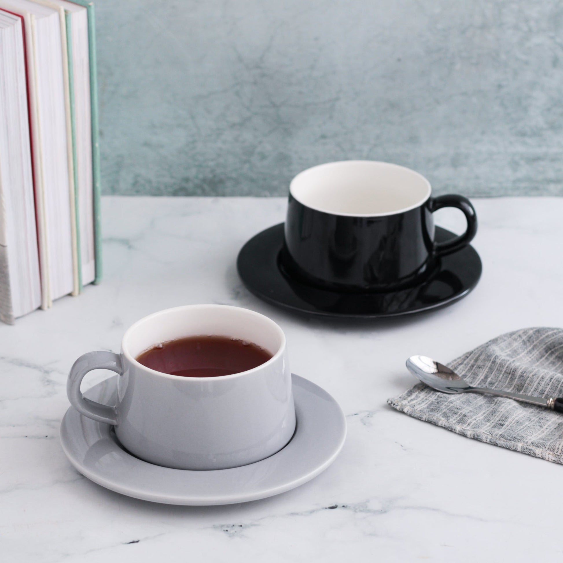 A cup and a saucer set made of ceramic. The cup can be used for serving hot drinks like tea, coffee, milk or hot chocolate. The set will look perfect while serving guests and can also be used for gifting.