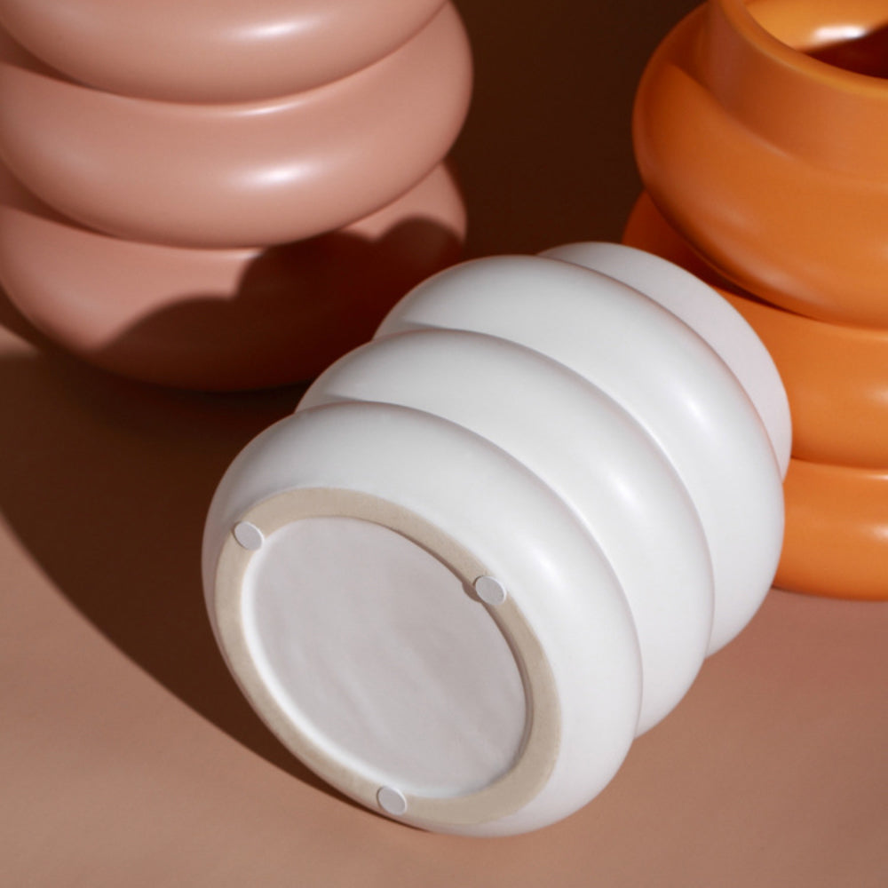 Decorative indoor flower pot that comes in three variants and is apt for being used in any modern or contemporary household setup. The vases have a caterpillar like shape on the surface and a flat neck. The flower pots can also be used as a pen stands on any desk to add a modern aesthetic to the table.